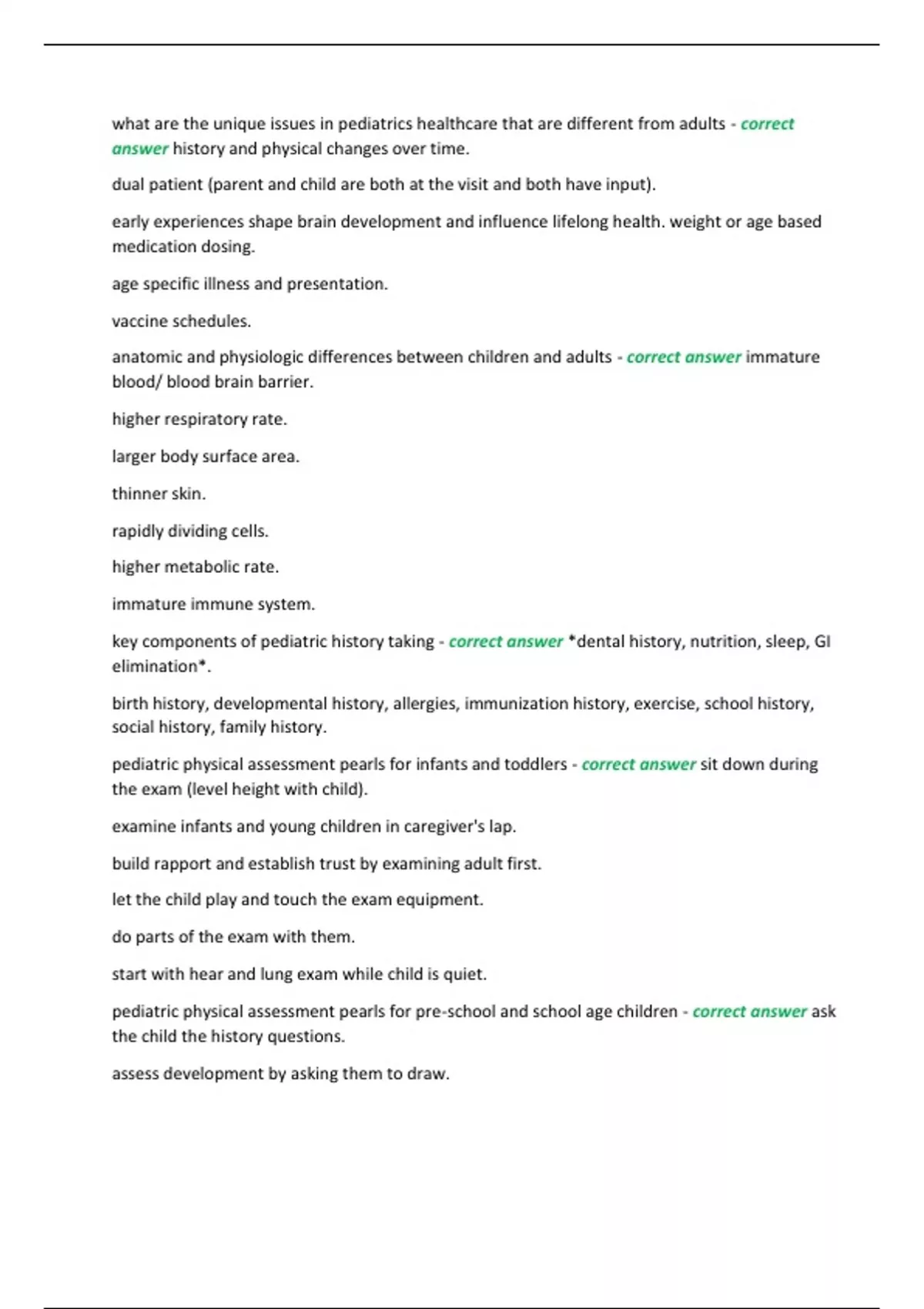 what are the unique issues in pediatrics healthcare that are different from adults - correct answer history and physical changes over time. dual patient (parent and child are both at the visit and both have input). early experiences shape brain development and influence lifelong health. weight or age based medication dosing. age specific illness and presentation. vaccine schedules. anatomic and physiologic differences between children and adults - correct answer immature blood/ blood brain barrier. higher respiratory rate.