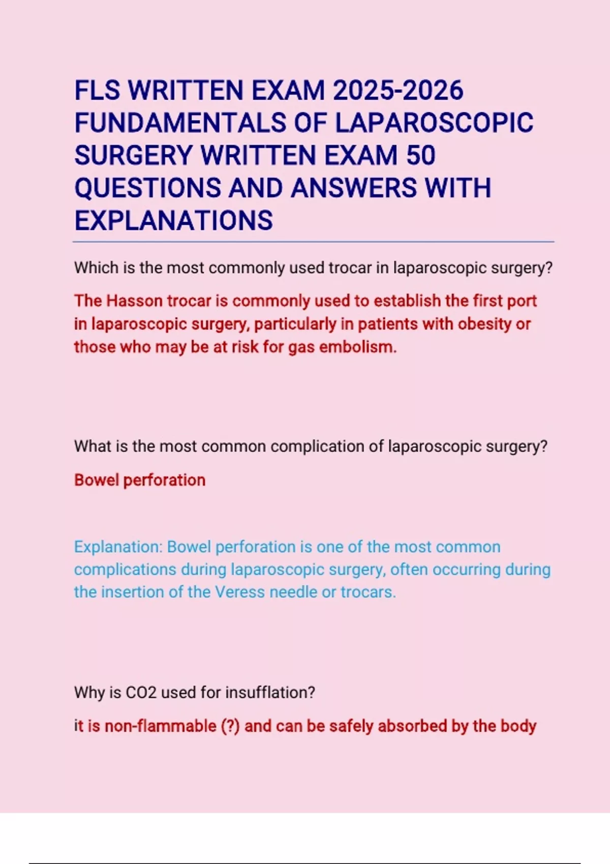 FLS WRITTEN EXAM FUNDAMENTALS OF LAPAROSCOPIC SURGERY WRITTEN EXAM 50 QUESTIONS AND ANSWERS WITH EXPLANATIONS