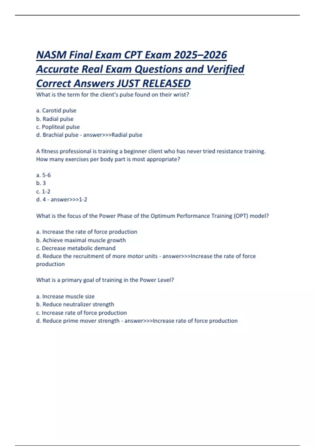 This document contains the complete set of real exam questions with verified correct answers for the NASM (National Academy of Sports Medicine) Certified Personal Trainer (CPT) Final Exam for the 2025–2026 cycle. It covers essential topics such as exercise science, program design, client assessment, corrective exercise, nutrition basics, professional ethics, and the OPT™ Model. Perfect for fitness professionals preparing for NASM CPT certification or reviewing core personal training concepts.