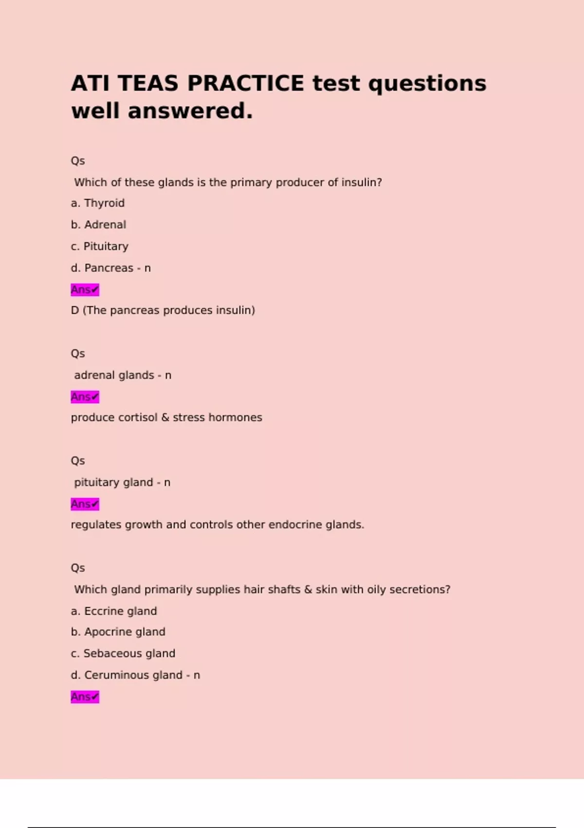 ATI TEAS PRACTICE test questions well answered. Qs Which of these glands is the primary producer of insulin? a. Thyroid b. Adrenal c. Pituitary d. Pancreas - n Ans D (The pancreas produces insulin) Qs adrenal glands - n Ans produce cortisol & stress hormones Qs pituitary gland - n Ans regulates growth and controls other endocrine glands. Qs Which gland primarily supplies hair shafts & skin with oily secretions? a. Eccrine gland b. Apocrine gland c. Sebaceous gland d. Ceruminous gland - n