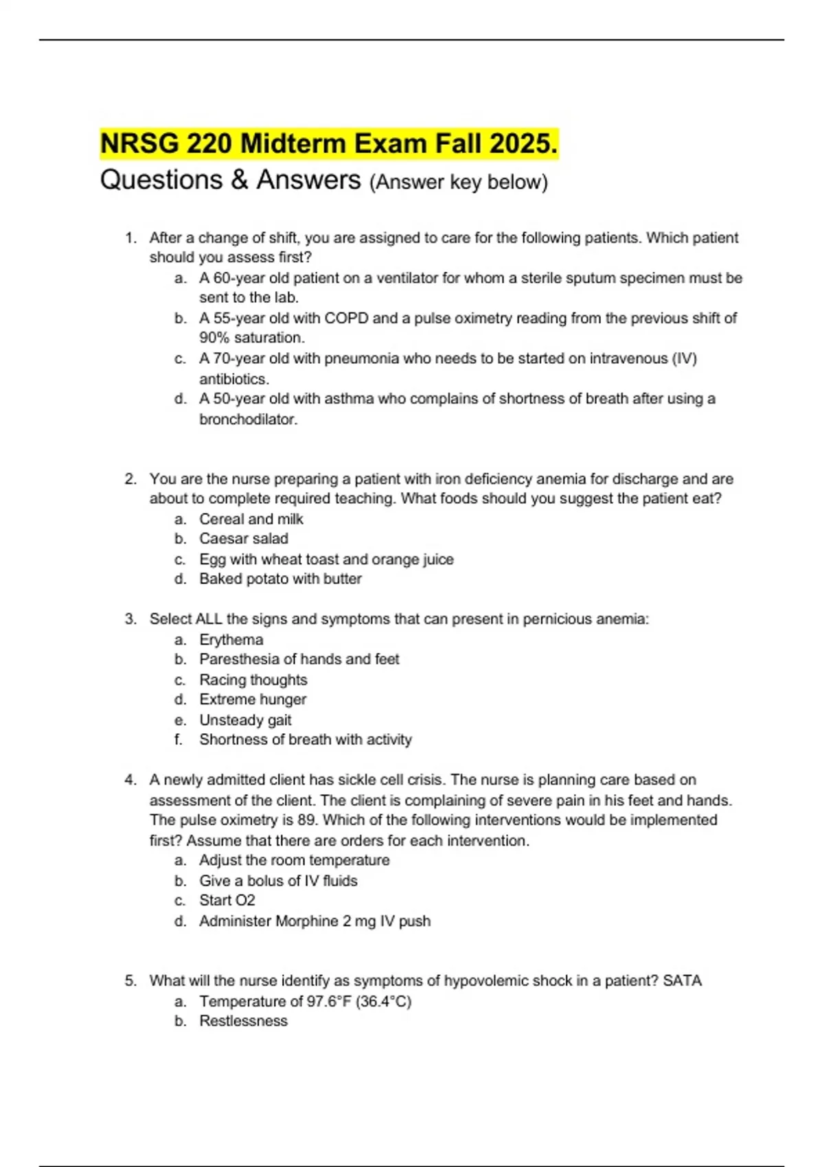 5. What will the nurse identify as symptoms of hypovolemic shock in a patient? SATA