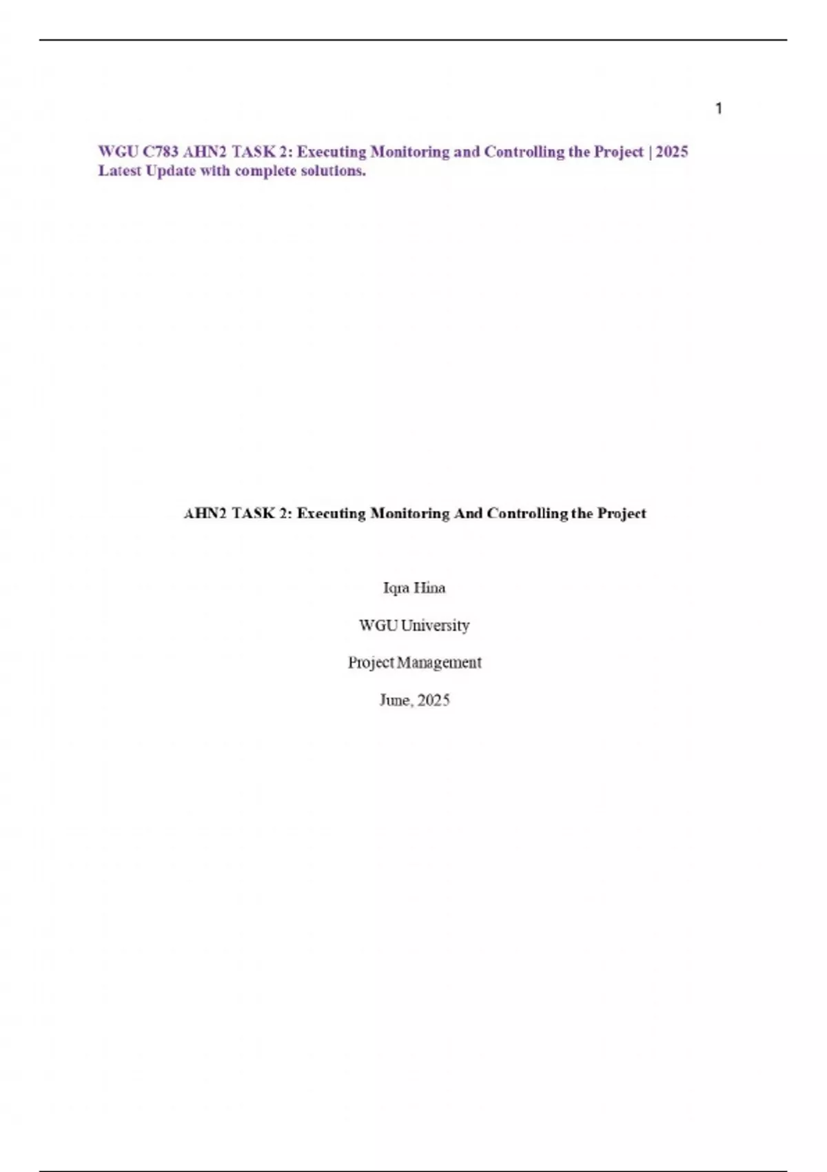 WGU C783 AHN2 TASK 2: Executing Monitoring and Controlling the Project | 2025 Latest Update with complete solutions.