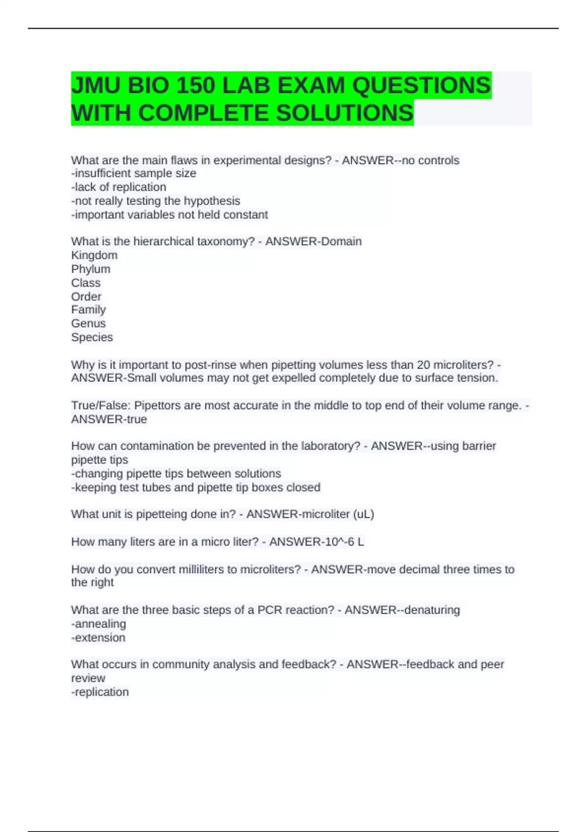 JMU BIO 150 LAB EXAM QUESTIONS WITH COMPLETE SOLUTIONS