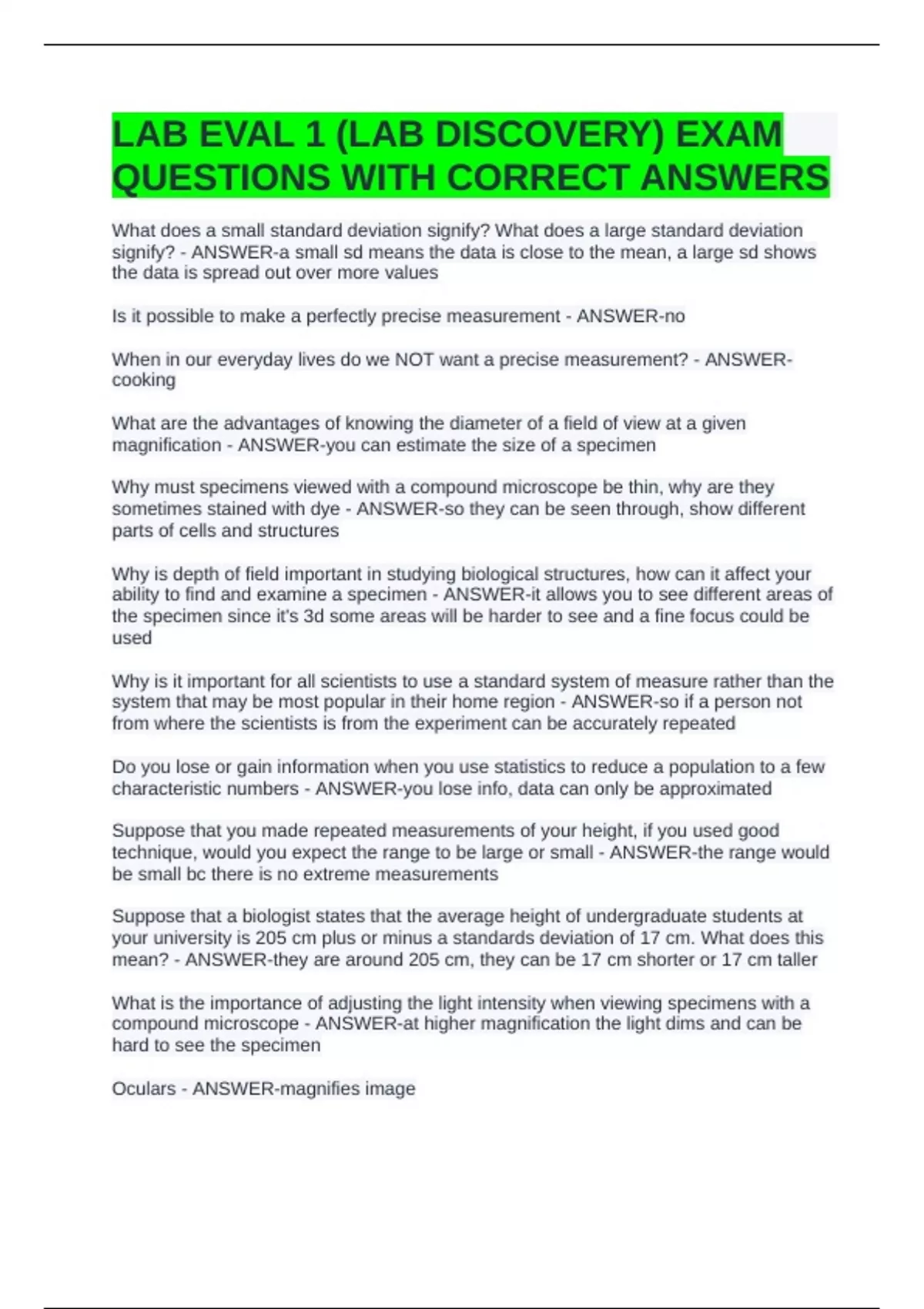 LAB EVAL 1 (LAB DISCOVERY) EXAM QUESTIONS WITH CORRECT ANSWERS