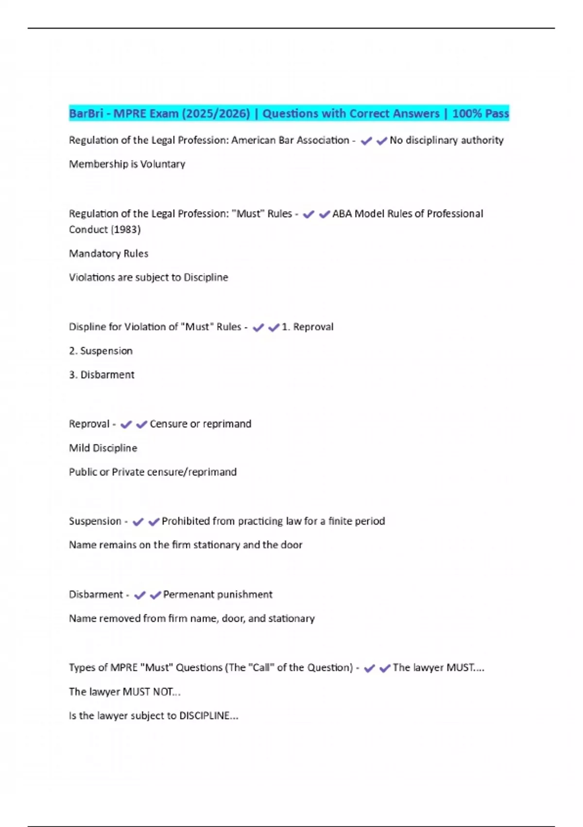 BarBri - MPRE Exam (2025/2026) | Questions with Correct Answers | 100% Pass