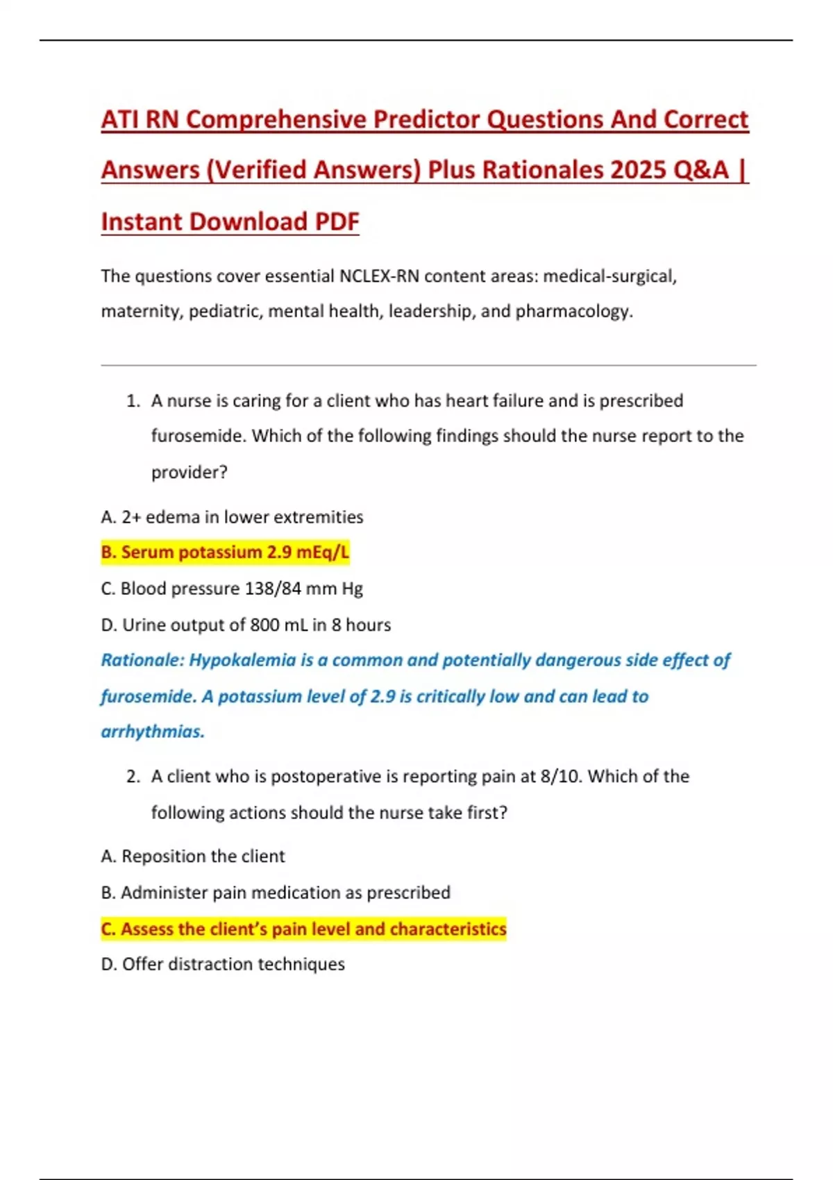 The questions cover essential NCLEX-RN content areas: medical-surgical,