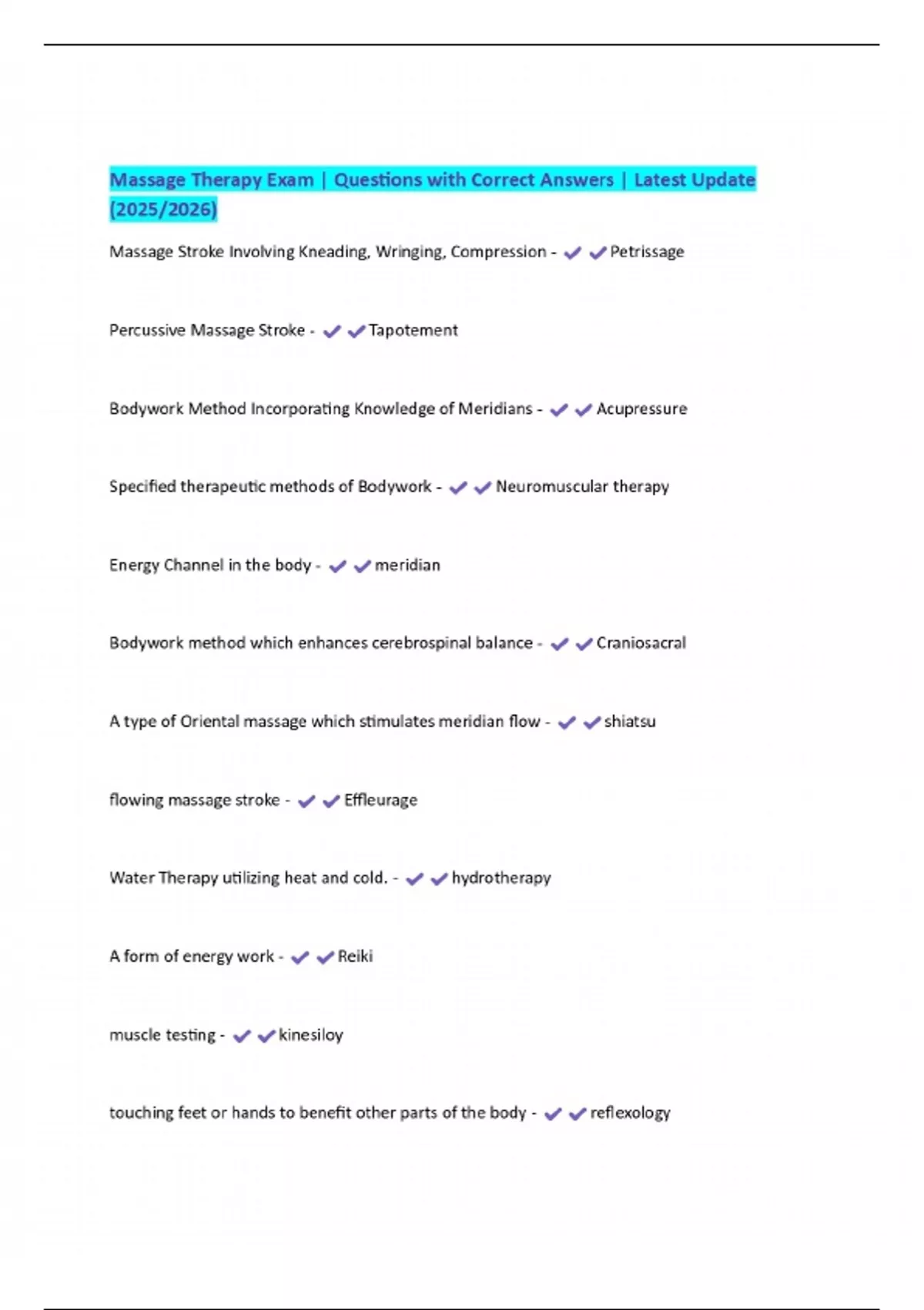 Massage Therapy Exam | Questions with Correct Answers | Latest Update (2025/2026)
