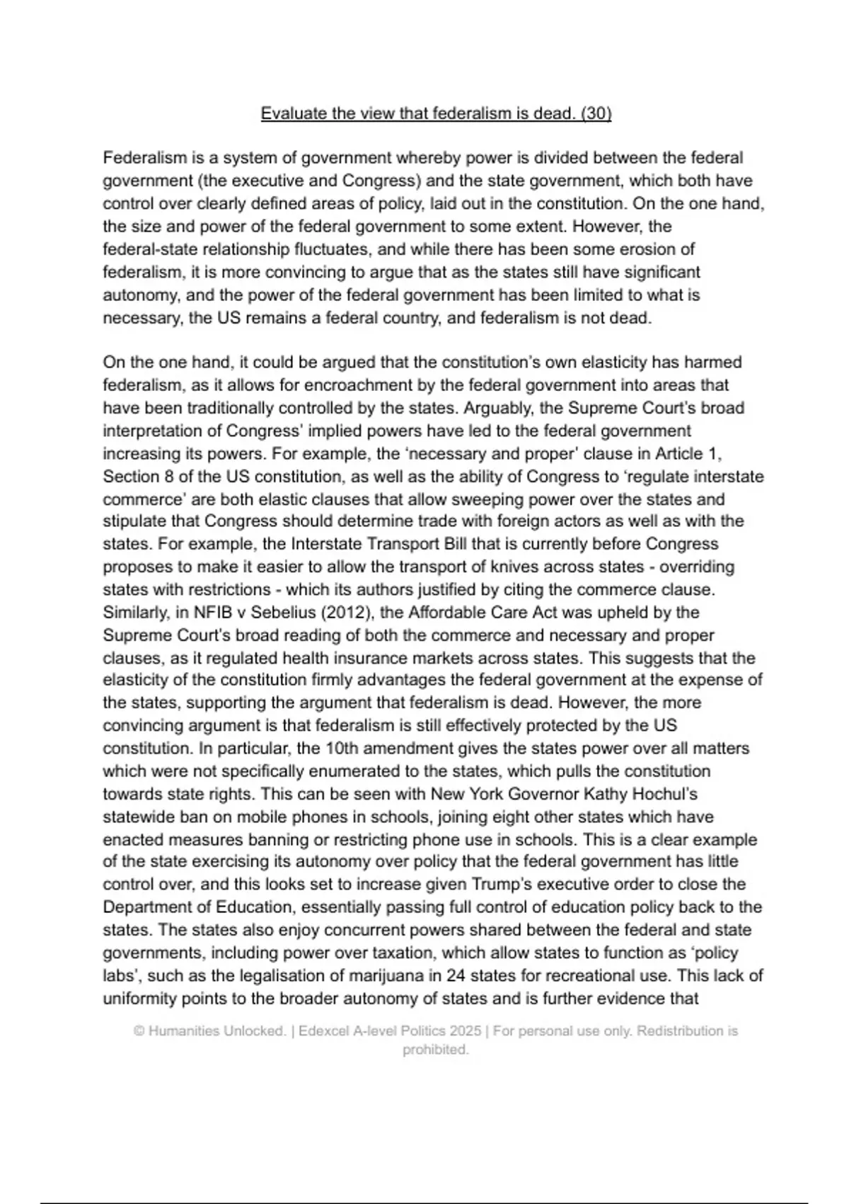 An A*/band 5 response to the question: Evaluate the view that federalism is dead. (30) This essay contains recent examples from 2024 + 2025, three key themes and a a clear and consistent line of argument. Perfect for revision for the 2025 exam series and mocks.
