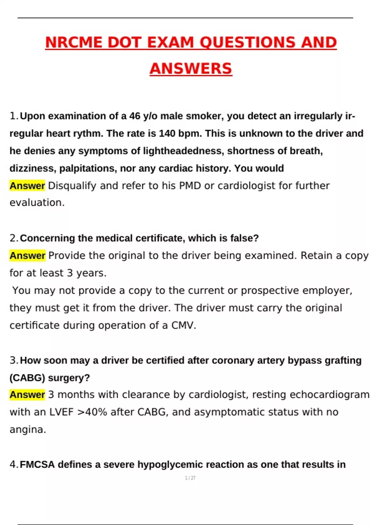 NRCME DOT Actual Exam Questions 2025 | Questions with 100% Correct Answers | Verified | Updated 2025 / 2026