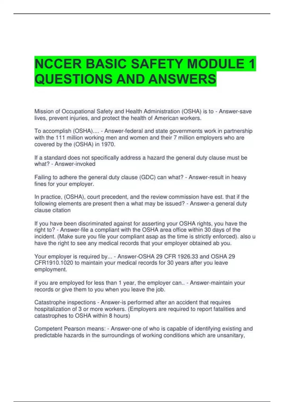 NCCER BASIC SAFETY MODULE 1 QUESTIONS AND ANSWERS