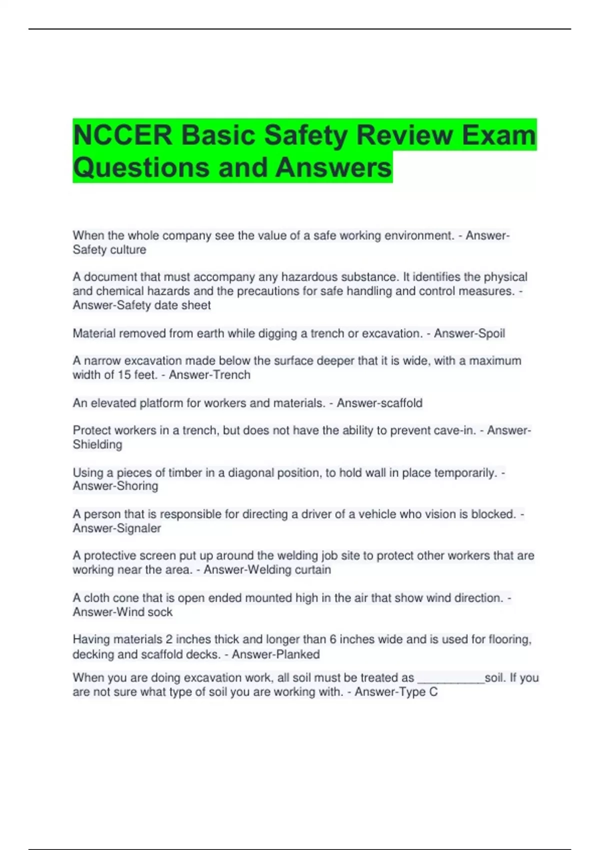 NCCER Basic Safety Review Exam Questions and Answers