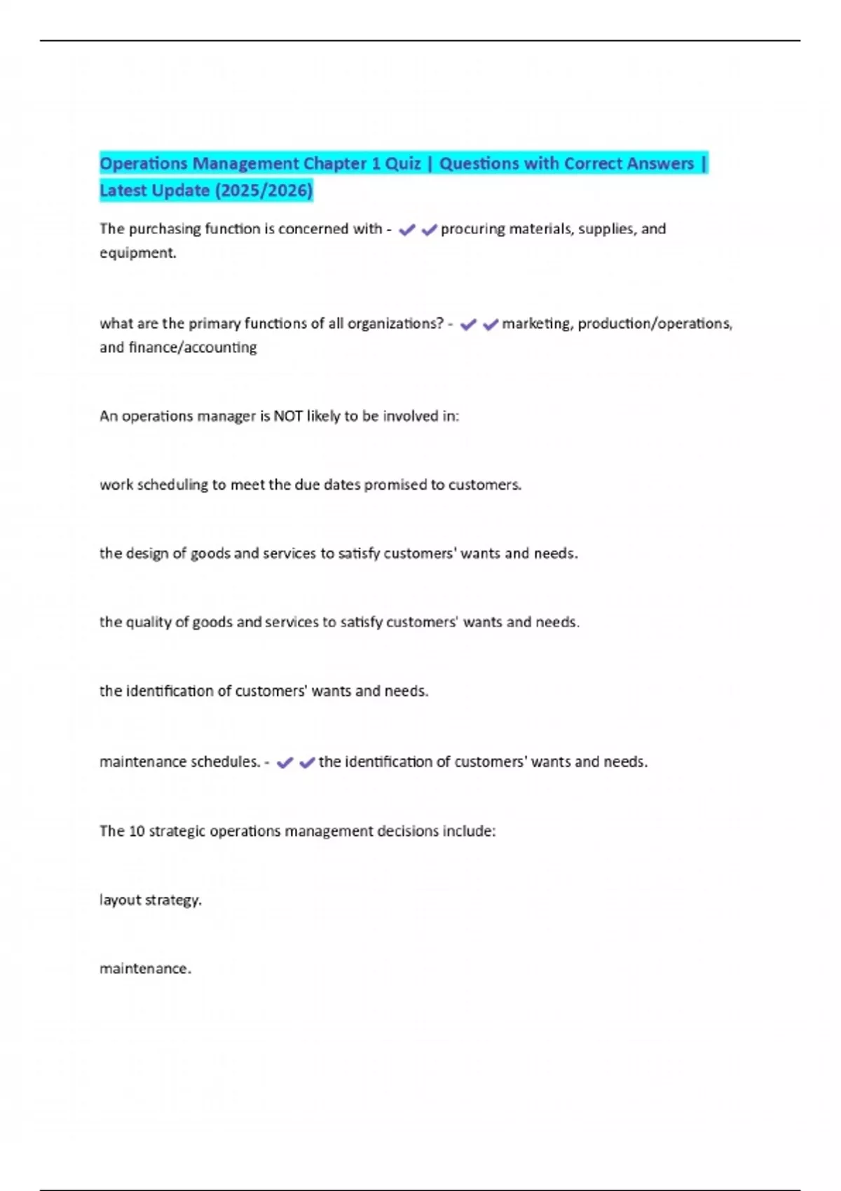 Operations Management Chapter 1 Quiz | Questions with Correct Answers | Latest Update (2025/2026)