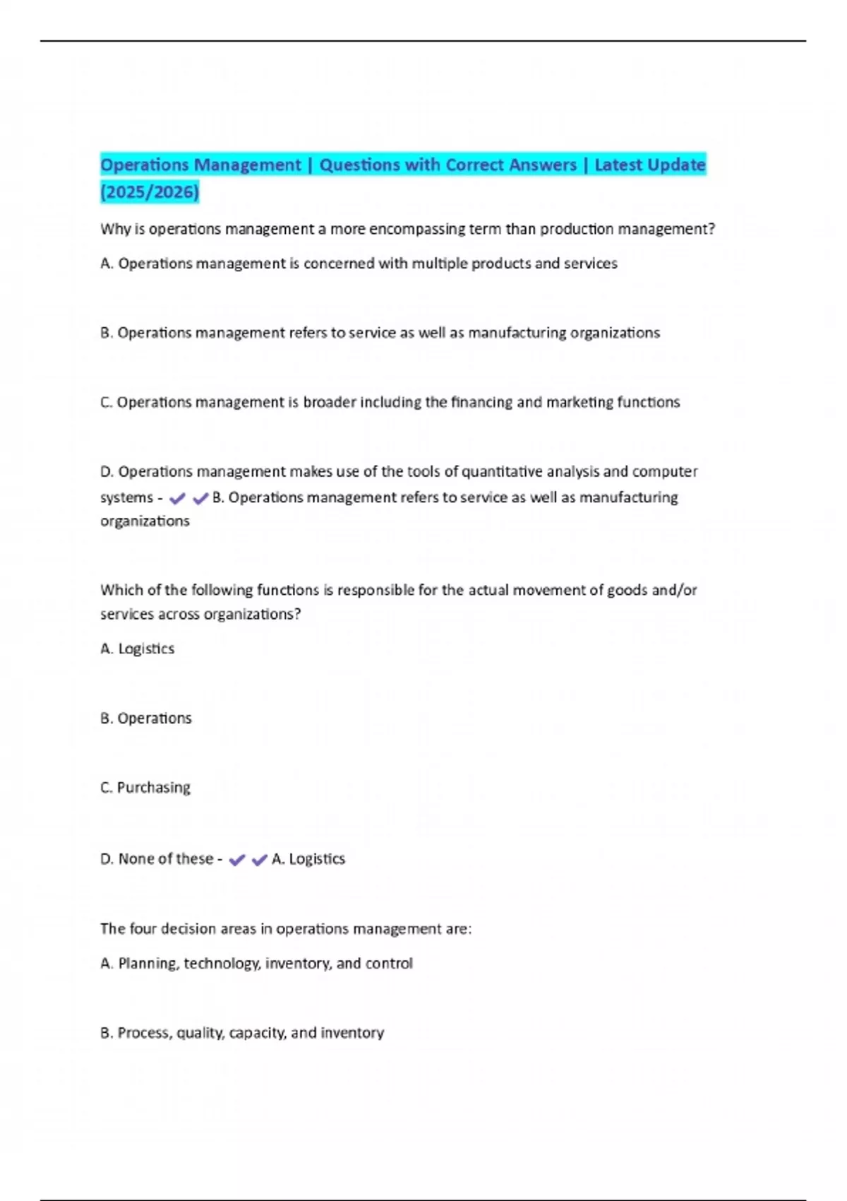 Operations Management | Questions with Correct Answers | Latest Update (2025/2026)