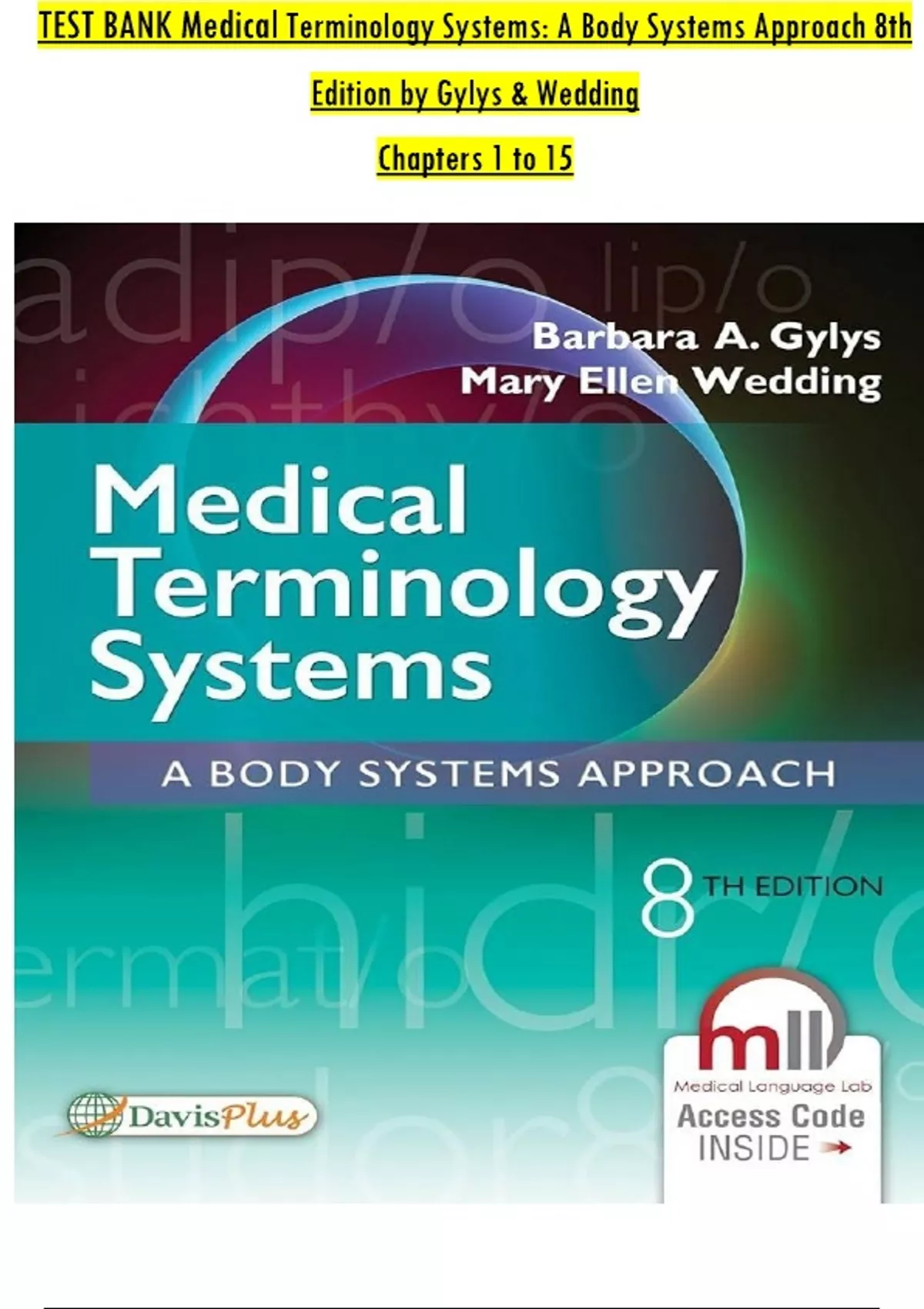 TEST BANK for Medical Terminology Systems: A Body Systems Approach 8th Edition by Barbara Gylys & Mary Ellen Wedding 9780803658677 Chapters 1-15 Complete Guide. Chapters Covered Include: Chapter 1. Basic Elements of a Medical Word Chapter 2. Suffixes Chapter 3. Prefixes Chapter 4. Body Structure Chapter 5. Integumentary System Chapter 6. Digestive System Chapter 7. Respiratory System Chapter 8. Cardiovascular System Chapter 9. Blood, Lymphatic, and Immune Systems Chapter 10. Musculoskeletal System Chapter 11. Urinary System Chapter 12. Female Reproductive System Chapter 13. Male Reproductive System Chapter 14. Endocrine System Chapter 15. Nervous System