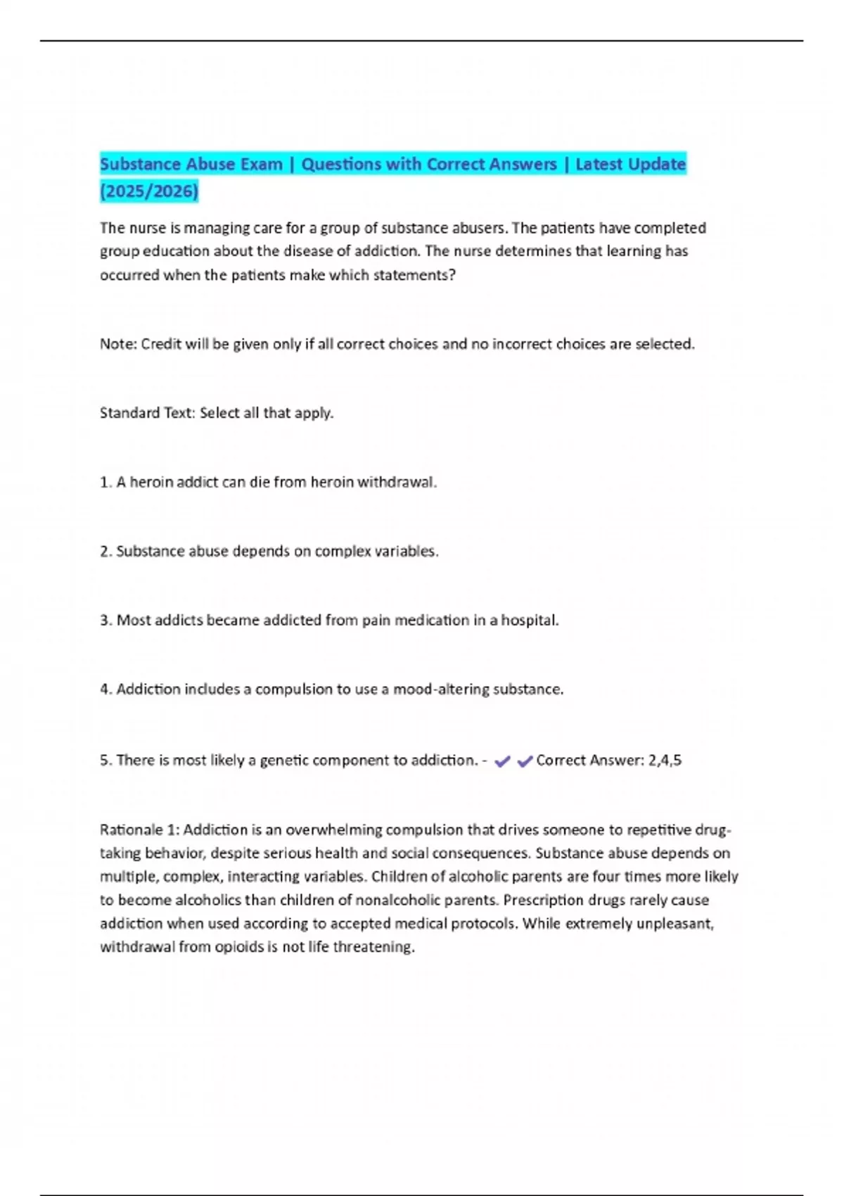 Substance Abuse Exam | Questions with Correct Answers | Latest Update (2025/2026)