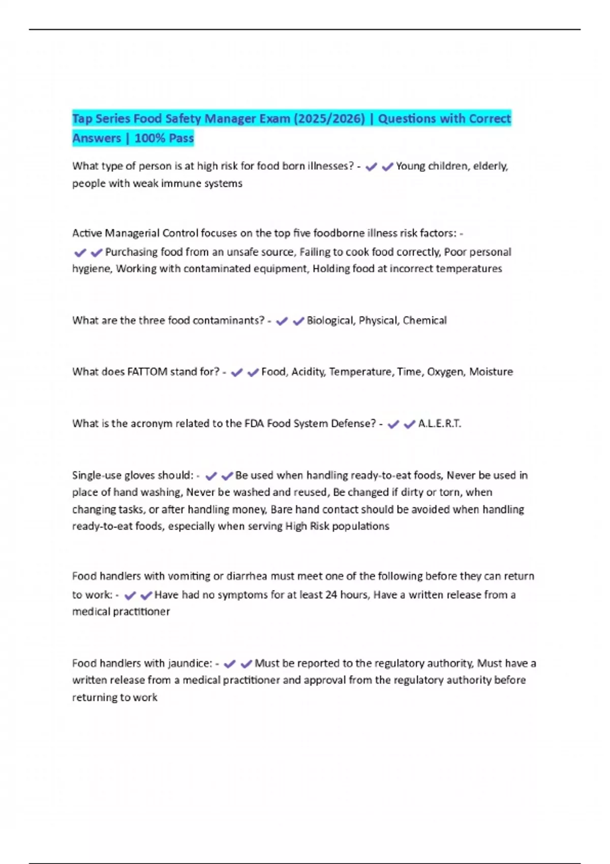 Tap Series Food Safety Manager Exam (2025/2026) | Questions with Correct Answers | 100% Pass