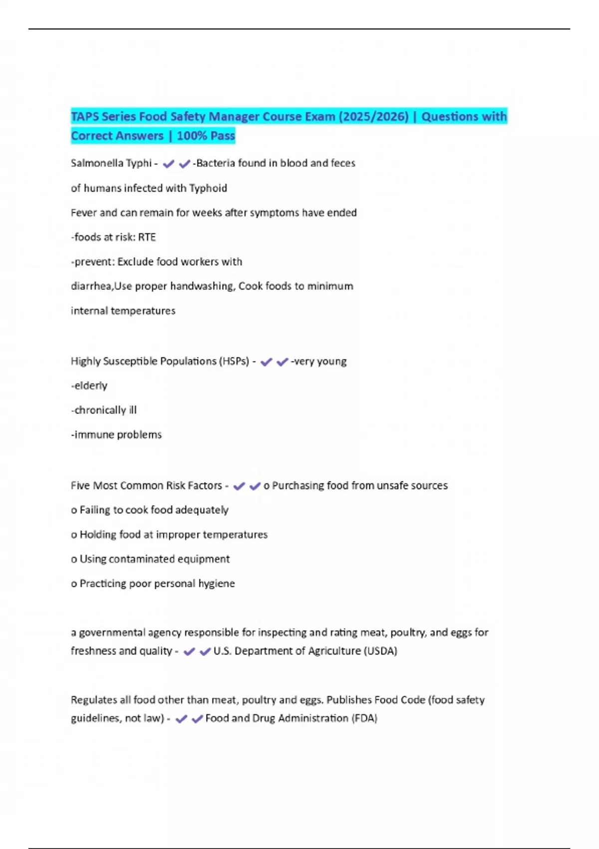 TAPS Series Food Safety Manager Course Exam (2025/2026) | Questions with Correct Answers | 100% Pass