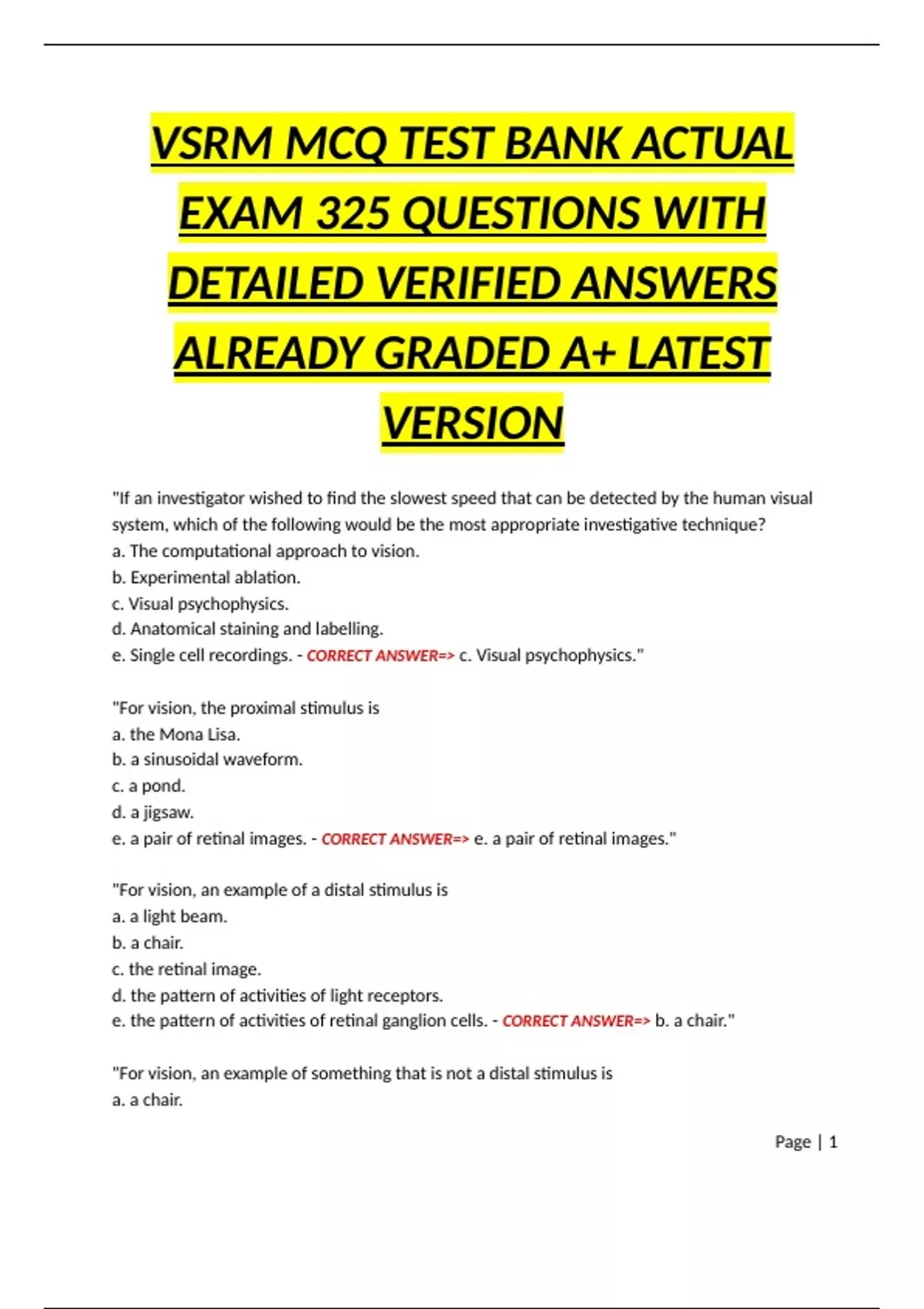 VSRM MCQ TEST BANK ACTUAL EXAM 325 QUESTIONS WITH DETAILED VERIFIED ANSWERS ALREADY GRADED A+ LATEST VERSION