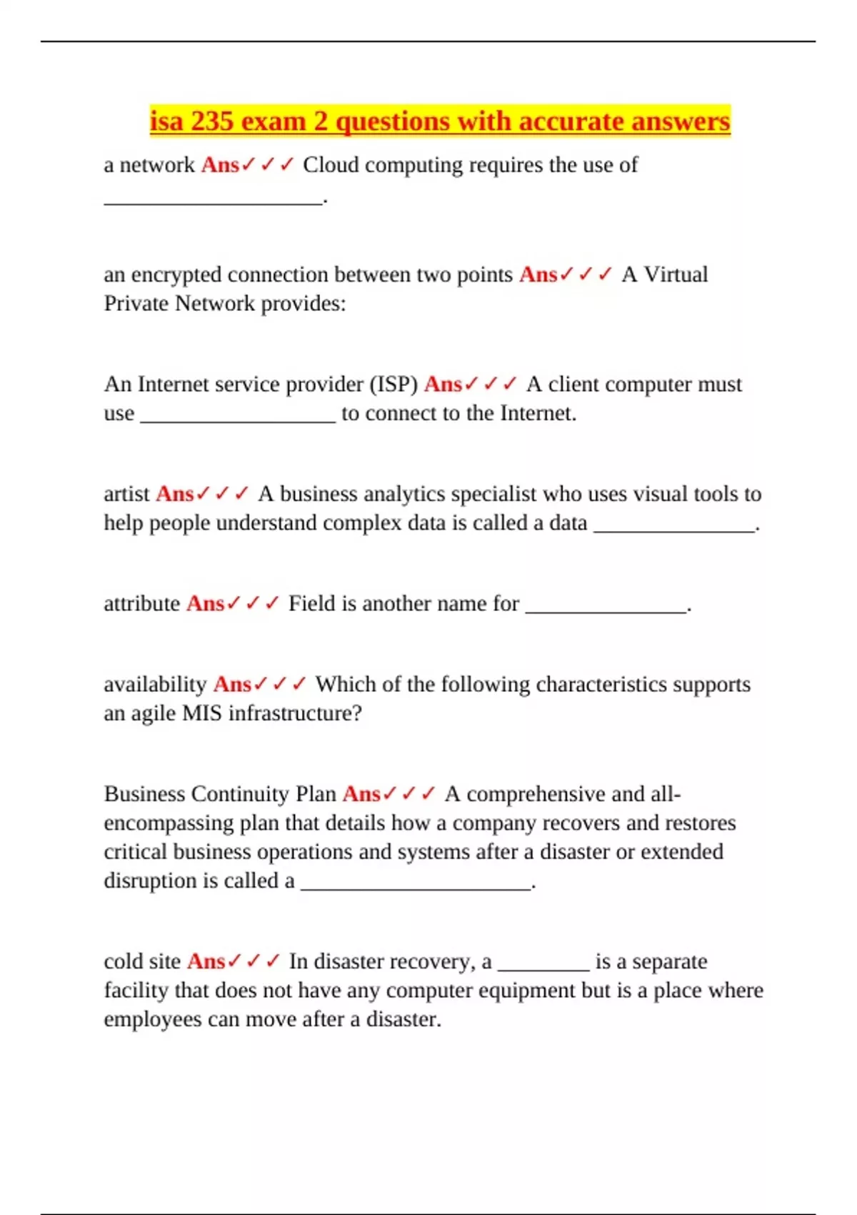 This document presents a complete and accurately verified set of multiple-choice questions and answers for ISA 235 Exam 2. Topics include cloud computing models (PaaS, SaaS, IaaS), VPNs, blockchain principles, cybersecurity tools (firewalls, MDM/MAM), disaster recovery strategies (cold site, failover), database terms (ETL, metadata, master data management), GPS, data warehousing, RFID, Moore’s Law, network protocols (TCP/IP, WEP), and agile MIS infrastructure. It is ideal for MIS students seeking final exam review at Miami University.