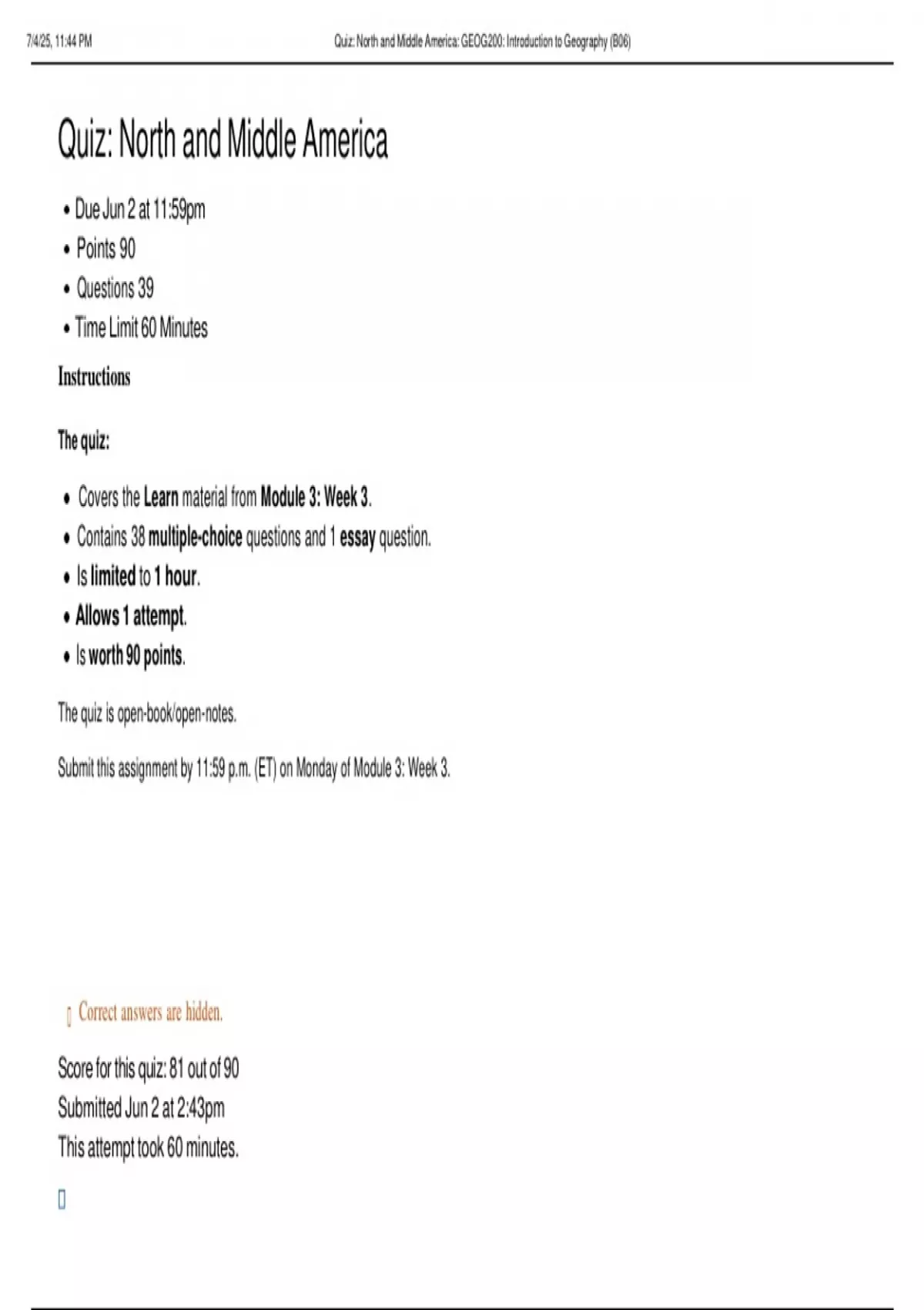 GEOG 200 Quiz: North and Middle America | Score 81/90 | Liberty University