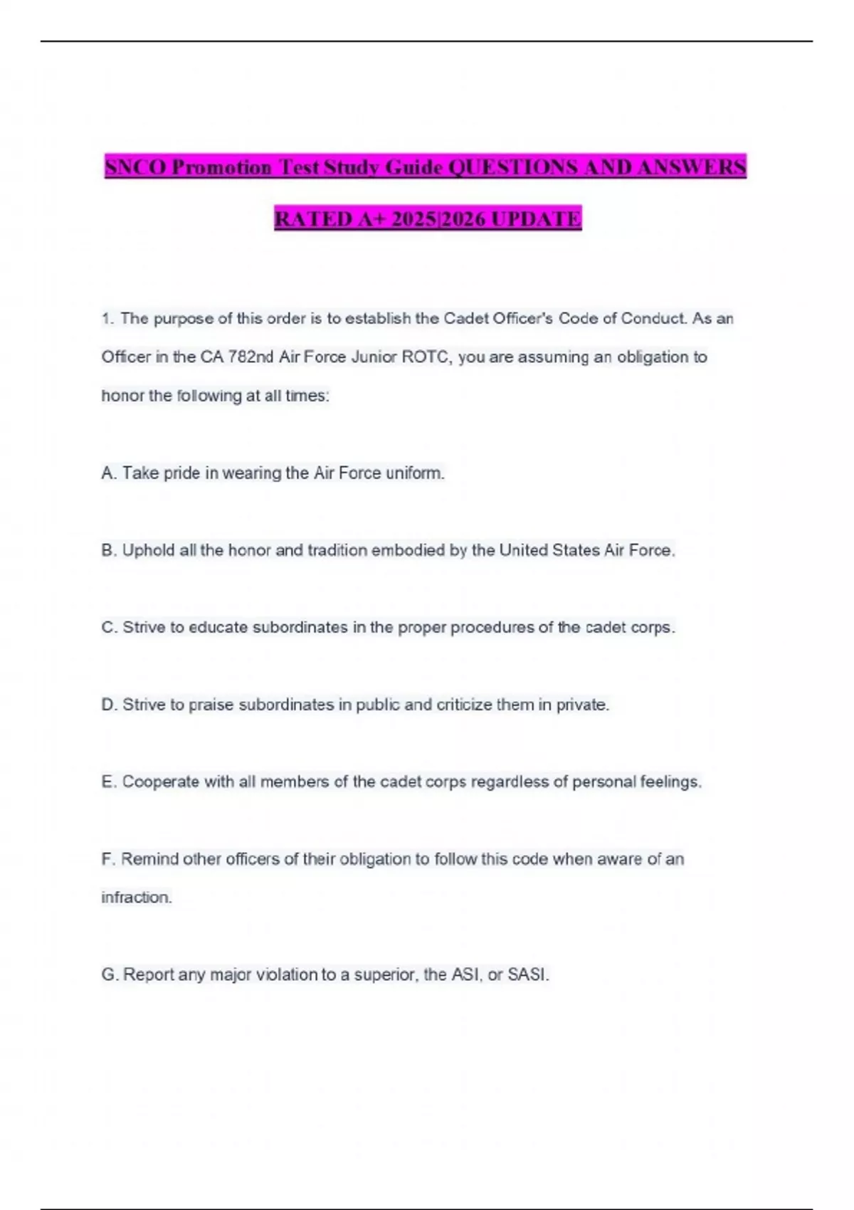 SNCO Promotion Test Study Guide QUESTIONS AND ANSWERS RATED A+ 2025|2026 UPDATE 1. The purpose of this order is to establish the Cadet Officer's Code of Conduct. As an Officer in the CA 782nd Air Force Junior ROTC, you are assuming an obligation to honor the following at all times: A. Take pride in wearing the Air Force uniform. B. Uphold all the honor and tradition embodied by the United States Air Force. C. Strive to educate subordinates in the proper procedures of the cadet corps. D. Strive to praise subordinates in public and criticize them in private. E. Cooperate with all members of the cadet corps regardless of personal feelings. F. Remind other officers of their obligation to follow this code when aware of an infraction.