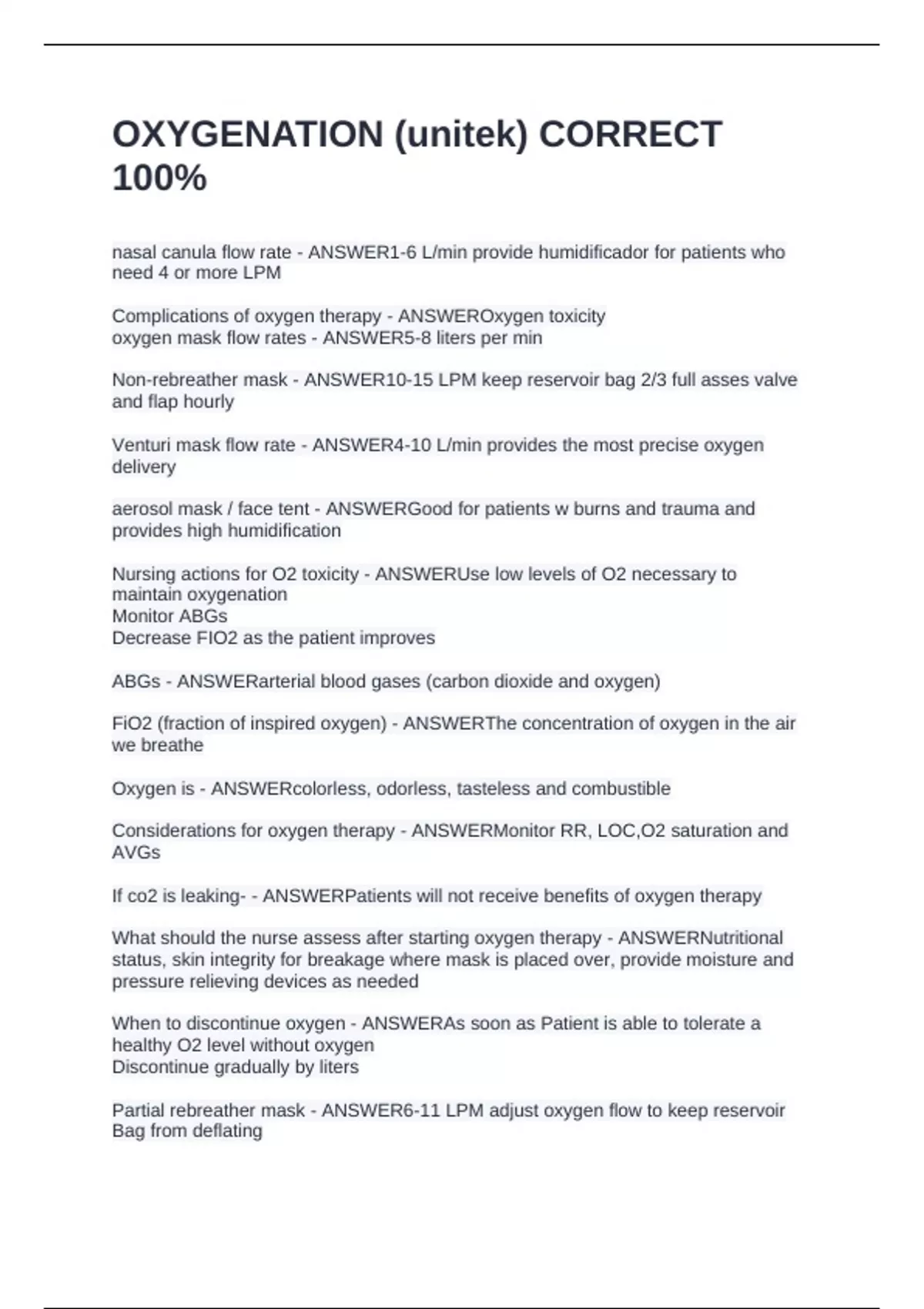What should the nurse assess after starting oxygen therapy - ANSWERNutritional