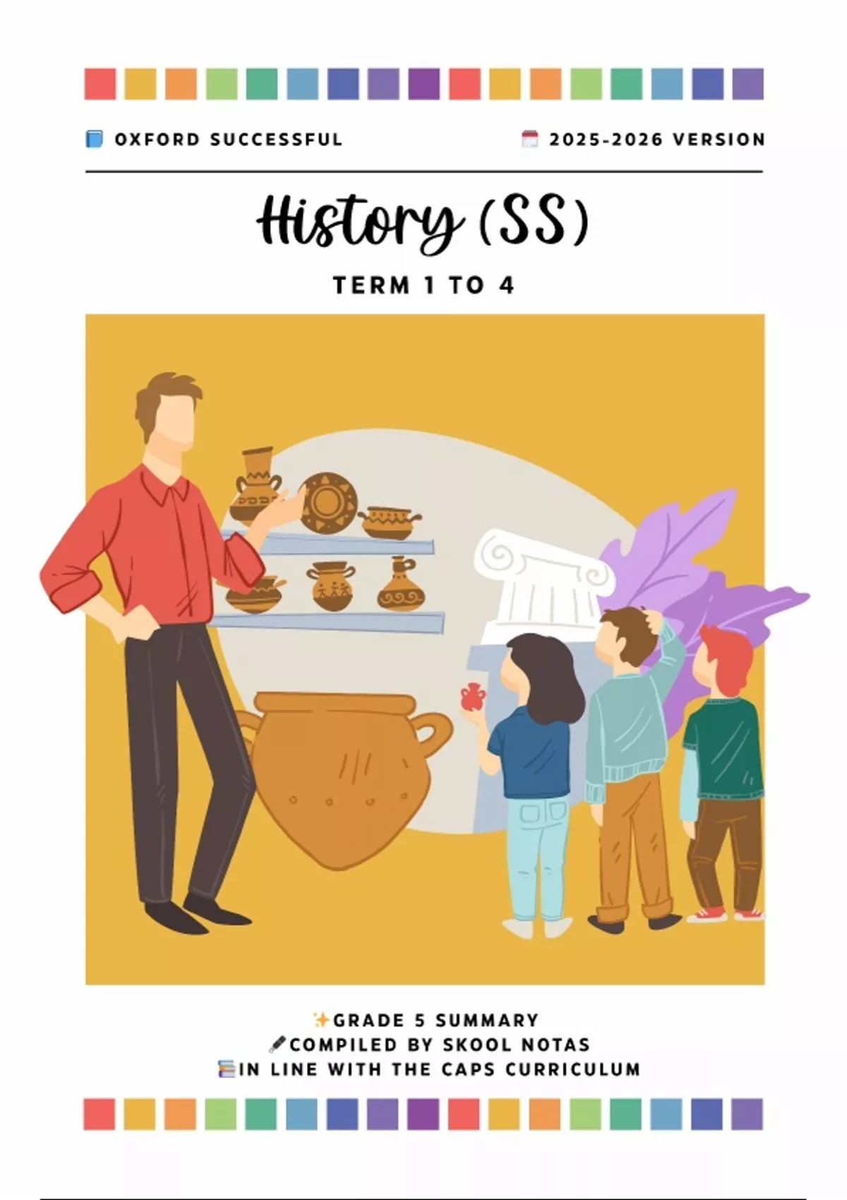 This complete Grade 5 History summary follows the Oxford Successful curriculum and covers all four terms in a clear, learner-friendly format. It helps students grasp key concepts quickly and is perfect for test and exam preparation. Parents can confidently use it to support their children’s learning at home, while teachers can incorporate it as a valuable classroom resource. This summary is a time-saving, high-value tool for any Grade 5 learner.