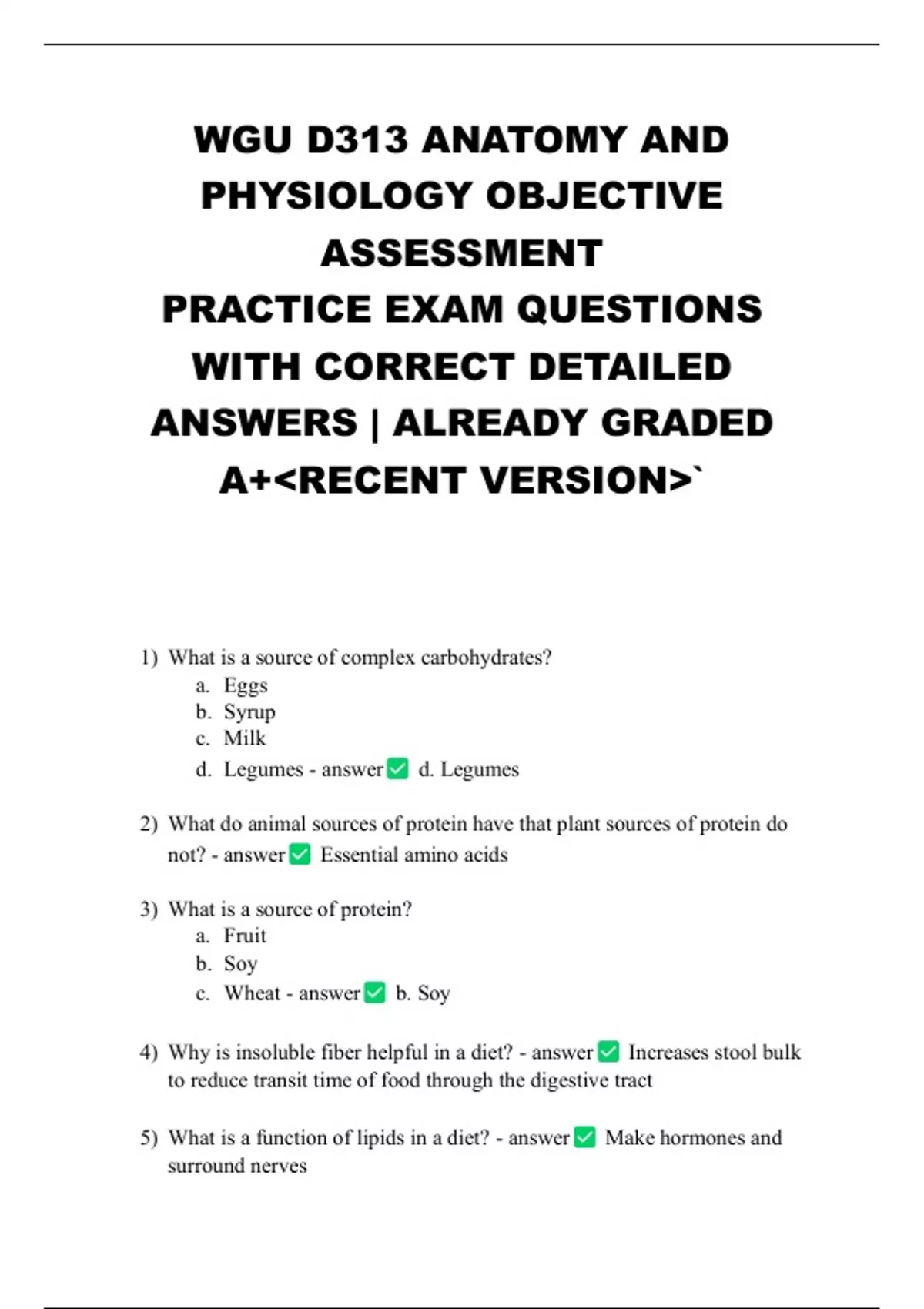 WGU D313 ANATOMY AND PHYSIOLOGY OBJECTIVE ASSESSMENT PRACTICE EXAM QUESTIONS WITH CORRECT DETAILED ANSWERS | ALREADY GRADED A+RECENT VERSION` 1) What is a source of complex carbohydrates? a. Eggs b. Syrup c. Milk d. Legumes - answer d. Legumes 2) What do animal sources of protein have that plant sources of protein do not? - answer Essential amino acids 3) What is a source of protein? a. Fruit b. Soy c. Wheat - answer b. Soy 4) Why is insoluble fiber helpful in a diet? - answer Increases stool bulk to reduce transit time of food through the digestive tract 5) What is a function of lipids in a diet? - answer Make hormones and surround nerves 6) What is a characteristic of unsaturated fats? - answer Liquid at room temperature 7) What are 2 major functions of the pancreas? - answer 1. Produces insulin and glucagon to control blood sugar levels. 2. Secretes digestive enzymes to break down macronutrients. 8) What are 2 functions of the peritoneum? - answer 1. Anchors intestines to the abdominal wall. 2. Prevents friction between the abdominal organs. 9) Which process occurs throughout most of the alimentary canal? - answer Propulsion 10) Which organ of the digestive system mixes and churns food with the gastric juices to form chyme? - answer Stomach 11) What is the function of saliva? - answer Assists in the taste sensation 12) What is the correct path that food takes through the large intestine? - answer Cecum, ascending colon, transverse colon, descending colon, sigmoid colon 13) Which cells of the stomach secrete digestive hormones? - answer Enteroendocrine cells 14) What is a function of the upper esophageal sphincter? - answer Allows food bolus to pass from the pharynx into the esophagus 15) What is the goal of peristalsis? - answer Propel bolus or chyme along the digestive tract 16) What happens during the buccal phase of deglutition? - answer A single food bolus is formed 17) What triggers the defecation reflex? - answer Stretching of the walls of the rectum 18) Parietal cells secrete _____ - answer Hydrochloric acid 19) Pancreatic juice ____ - answer Buffers chyme 20) Where does the chemical digestion of starch begin? - answer Mouth 21) What are 2 functions of rugae of the stomach? - answer 1. Allows for expansion of the stomach. 2. Increase surface area. 22) What is the function of the mucin that is secreted by surface mucous cells in the stomach? - answer Protects the underlying mucosa from the acidity of the stomach contents 23) Which cells secrete an intrinsic factor that is essential for the absorption of Vitamin B12? - answer Parietal cells 24) Pepsinogen is secreted by ____ and converted to pepsin by _____. - answer Chief cells; hydrochloric acid 25) What is accomplished by peristaltic movements within the stomach? - answer Mixing bolus with gastric juices to produce chyme 26) Villi located within the small intestine function to ______. - answer Increase surface area 27) Why are Brunner's glands essential to the small intestine? - answer They secrete an alkaline mucus that neutralizes acidic chyme arriving from the stomach 28) What is broken down by the brush border enzymes? - answer Carbohydrates and proteins 29) If fecal matter passes through the large intestine too quickly, what will result? - answer Diarrhea 30) Amylases break down ____ and lipases break down ____. - answer Carbohydrates; fats 31) Which organ functions to break down toxins so they can be excreted from the kidneys? - answer Liver 32) Where does digestion of carbohydrates occur? - answer Oral cavity, small intestine, large intestine 33) Proteins are broken down into amino acids, which are used for ____. - answer The production of enzymes 34) What are the male gametes called? - answer Sperm 35) What is the function of the epididymis? - answer Sperm maturation and storage 36) What is the name of the inner layer of the testicular capsule that projects into the testes and divides each testes into lobules? - answer Tunica albuginea 37) What 2 things are found within the spermatic cord? - answer 1. Arteries and veins 2. Ductus deferens 38) In men, what passes through the inguinal canal? - answer Spermatic cord 39) The ductus deferens merge with the ducts of the seminal vesicles to form the____. - answer Ejaculatory duct 40) Which 2 organ systems are the male urethra part of? - answer 1. Reproductive 2. Urinary 41) The male urethra is ____ than the female urethra. - answer Longer 42) Which muscle wrinkles the skin of the scrotum to decrease the surface area and prevent heat loss? - answer Dartos muscle 43) Which glands are found at the base of the penis? - answer Bulbourethral glands 44) Which structure lies underneath the bladder and surrounds the beginning of the urethra? - answer Prostate gland 45) Which structure protects the entrance of the female reproductive tract and the female urethra? - answer Labia majora 46) In a female, what is the name for the pad of fat that lies over the pubic symphysis? - answer Mons pubis 47) Which part of the uterine tube comes in close contact with the ovarian surface? - answer Fimbriae 48) Which structure protrudes into the superior part of the vagina? - answer Cervix 49) Which layer of the uterine wall contracts during childbirth to expel the fetus? - answer Myometrium 50) The vagina lies ____ to the urethra and ____ to the rectum. - answer Posterior; anterior 51) What is the erectile organ in females called? - answer Clitoris 52) The urethral orifice is ____ to the vaginal orifice and ____ to the clitoris. - answer Anterior; posterior 53) What is the function of the greater vestibular glands? - answer Secrete mucus into the vagina during sexual arousal 54) Which ligaments support the uterus? - answer Round, broad, and transverse cervical 55) Lymphatic vessels of the breast drain into lymph nodes in the ____ region. - answer Axillary 56) What drains milk from the lobes to the center of the nipple? - answer Lactiferous ducts 57) Which hypothalamic hormone contributes to the regul