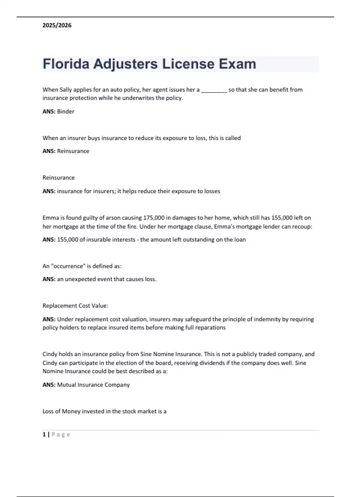This document includes the full set of questions and correct answers for the 2025/2026 Florida Adjusters License Exam. It covers key topics such as insurance fundamentals, property and casualty coverage, business and auto policies, homeowners and dwelling policies, commercial crime, flood, liability, and mechanical breakdown insurance. This comprehensive material is ideal for those preparing for the Florida 6-20 or All-Lines Adjuster License exam, and aligns with current state-specific regulations and insurance standards.
