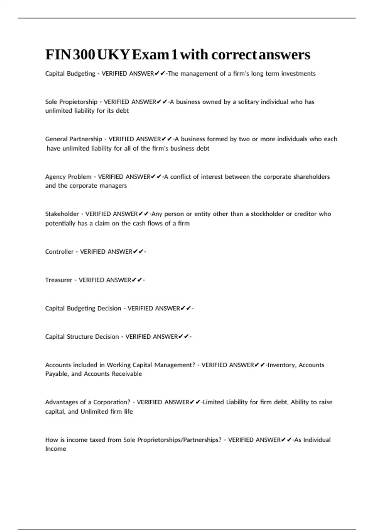 FIN 300 UKY Exam 1 with correct answers