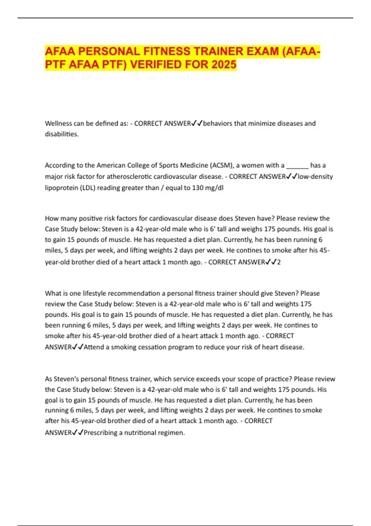 Wellness can be defined as: - CORRECT ANSWERbehaviors that minimize diseases and disabilities. According to the American College of Sports Medicine (ACSM), a women with a ______ has a major risk factor for atherosclerotic cardiovascular disease. - CORRECT ANSWERlow-density lipoprotein (LDL) reading greater than / equal to 130 mg/dl How many positive risk factors for cardiovascular disease does Steven have? Please review the Case Study below: Steven is a 42-year-old male who is 6' tall and weighs 175 pounds. His goal is to gain 15 pounds of muscle. He has requested a diet plan. Currently, he has been running 6 miles, 5 days per week, and lifting weights 2 days per week. He contines to smoke after his 45-year-old brother died of a heart attack 1 month ago. - CORRECT ANSWER2 What is one lifestyle recommendation a personal fitness trainer should give Steven? Please review the Case Study below: Steven is a 42-year-old male who is 6' tall and weights 175 pounds. His goal is to gain 15 pounds of muscle. He has requested a diet plan. Currently, he has been running 6 miles, 5 days per week, and lifting weights 2 days per week. He contines to smoke after his 45-year-old brother died of a heart attack 1 month ago. - CORRECT ANSWERAttend a smoking cessation program to reduce your risk of heart disease. As Steven's personal fitness trainer, which service exceeds your scope of practice? Please review the Case Study below: Steven is a 42-year-old male who is 6' tall and weights 175 pounds. His go