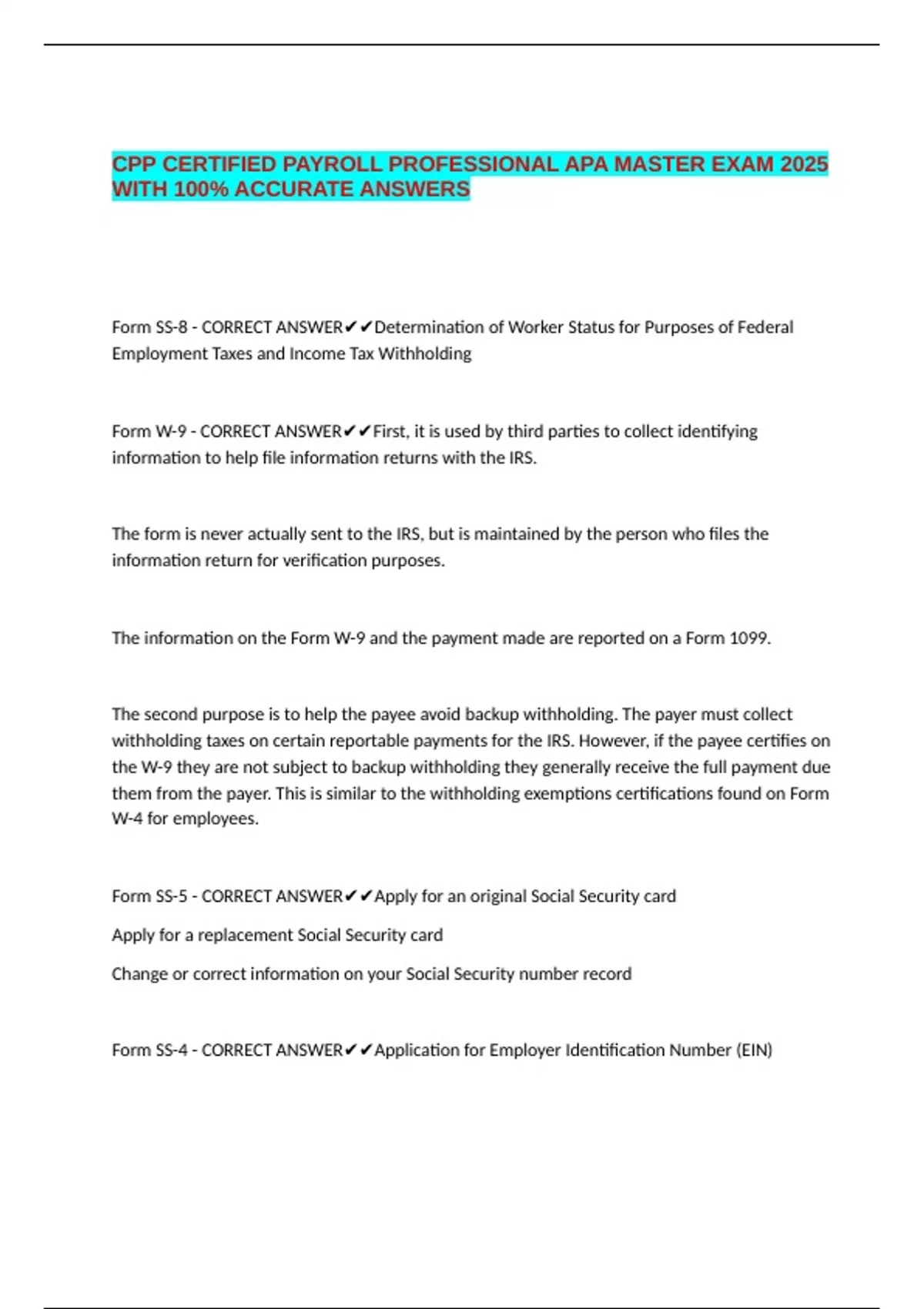 CPP CERTIFIED PAYROLL PROFESSIONAL APA MASTER EXAM 2025 WITH 100% ACCURATE ANSWERS