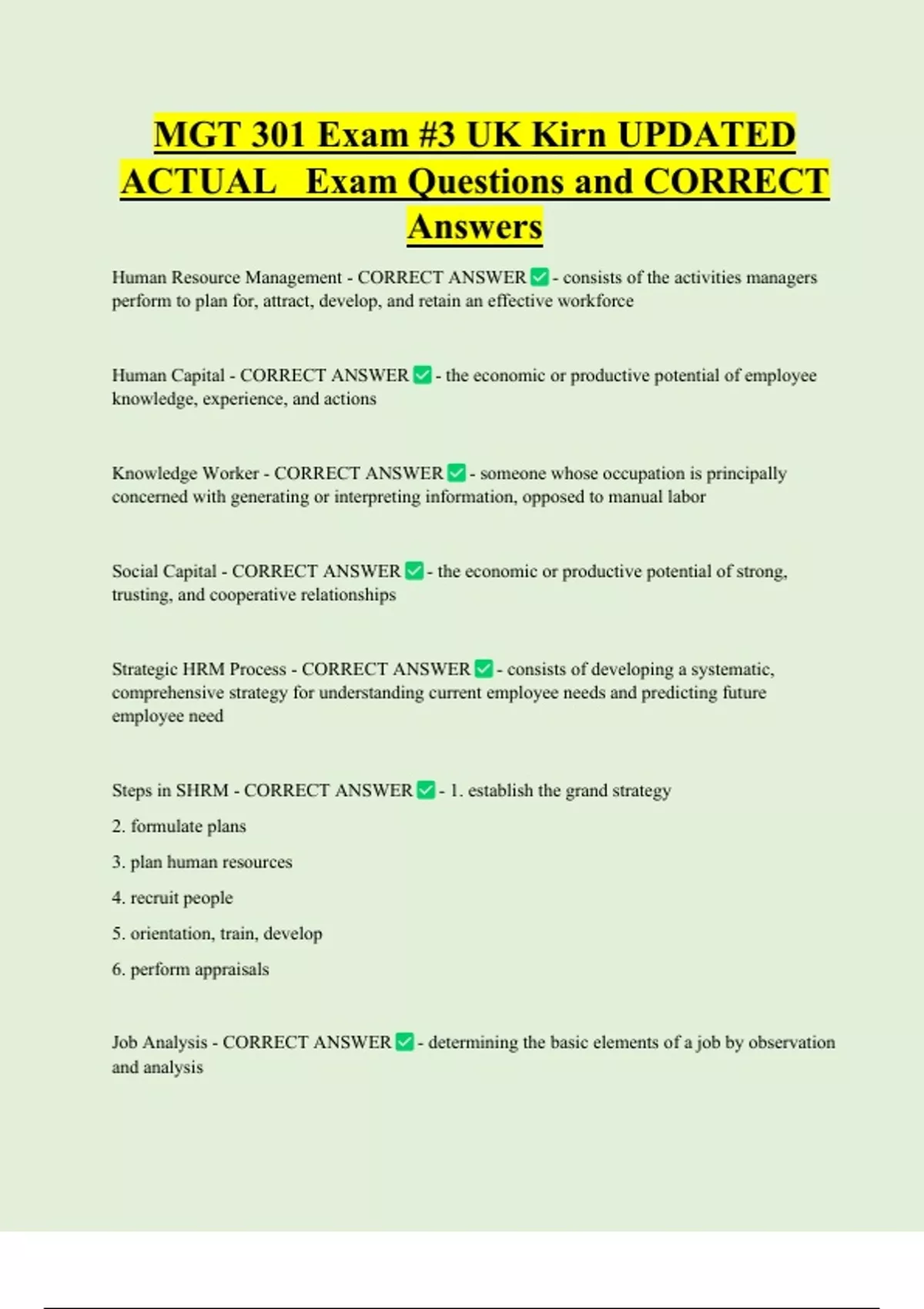MGT 301 Exam #3 UK Kirn UPDATED ACTUAL Exam Questions and CORRECT Answers Human Resource Management - CORRECT ANSWER - consists of the activities managers perform to plan for, attract, develop, and retain an effective workforce Human Capital - CORRECT ANSWER - the economic or productive potential of employee knowledge, experience, and actions Knowledge Worker - CORRECT ANSWER - someone whose occupation is principally concerned with generating or interpreting information, opposed to manual labo