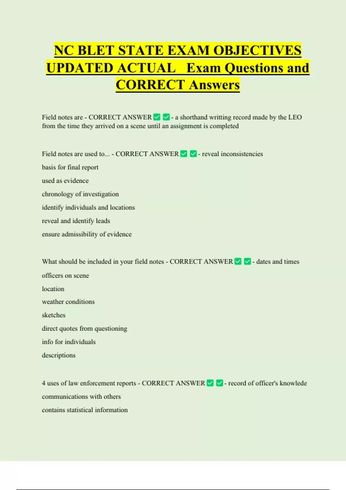 C BLET STATE EXAM OBJECTIVES UPDATED ACTUAL Exam Questions and CORRECT Answers Field notes are - CORRECT ANSWER - a shorthand writting record made by the LEO from the time they arrived on a scene until an assignment is completed Field notes are used to... - CORRECT ANSWER basis for final report used as evidence chronology of investigation identify individuals and locations reveal and identify leads ensure admissibility of evidence - reveal inconsistencies