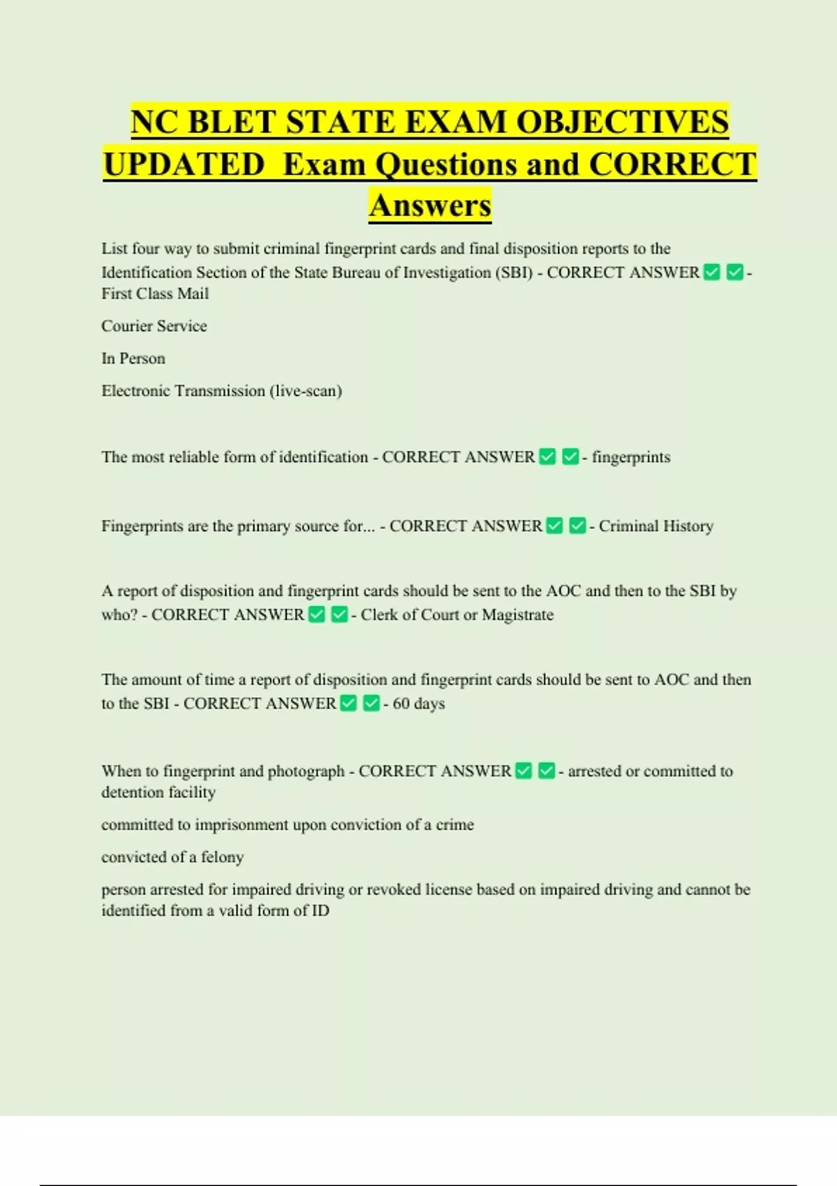 NC BLET STATE EXAM OBJECTIVES UPDATED Exam Questions and CORRECT Answers List four way to submit criminal fingerprint cards and final disposition reports to the Identification Section of the State Bureau of Investigation (SBI) - CORRECT ANSWER First Class Mail Courier Service In Person Electronic Transmission (live-scan) The most reliable form of identification - CORRECT ANSWER Fingerprints are the primary source for... - CORRECT ANSWER A report of disposition and fingerprint cards should be sent to the AOC and then to the SBI by who? - CORRECT ANSWER - Clerk of Court or Magistrate - - fingerprints - Criminal History