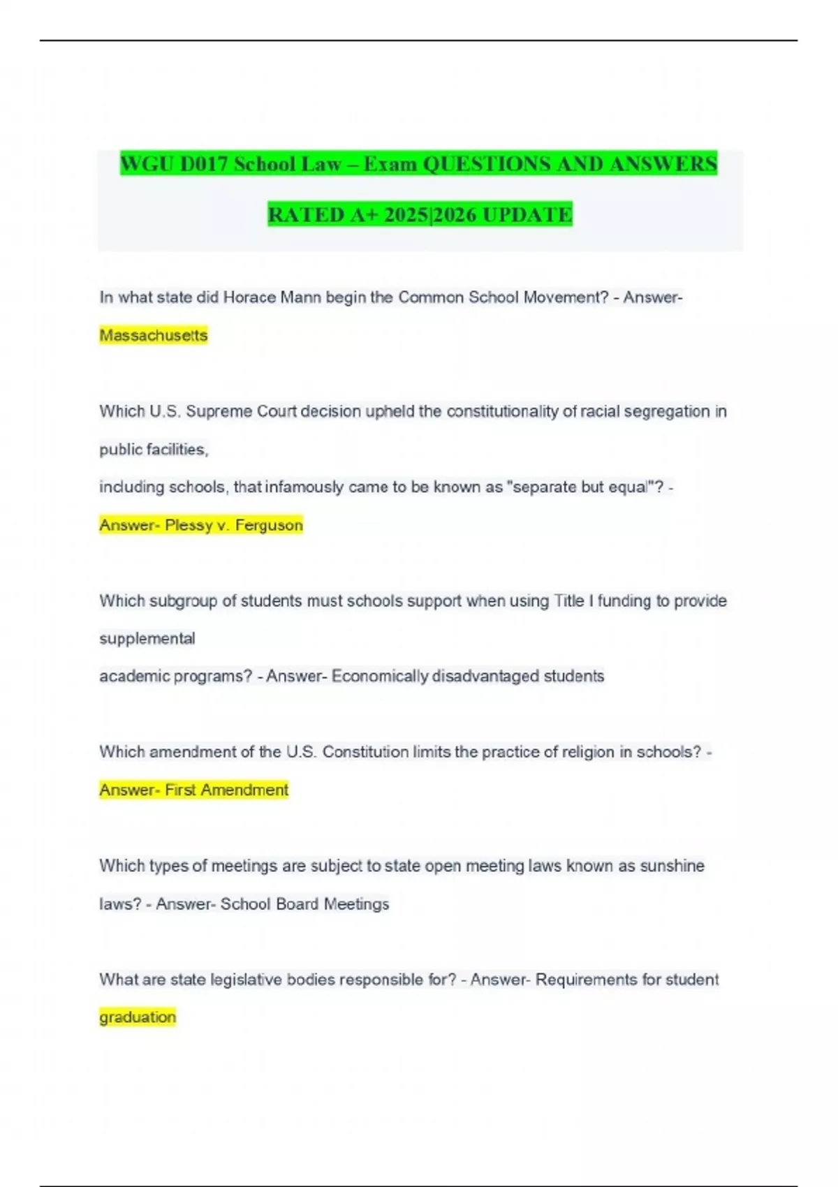 WGU D017 School Law – Exam QUESTIONS AND ANSWERS RATED A+ 2025|2026 UPDATE In what state did Horace Mann begin the Common School Movement? - AnswerMassachusetts Which U.S. Supreme Court decision upheld the constitutionality of racial segregation in public facilities, including schools, that infamously came to be known as "separate but equal"? - Answer- Plessy v. Ferguson Which subgroup of students must schools support when using Title I funding to provide supplemental academic programs? - Answer- Economically disadvantaged students Which amendment of the U.S. Constitution limits the practice of religion in schools? - Answer- First Amendment