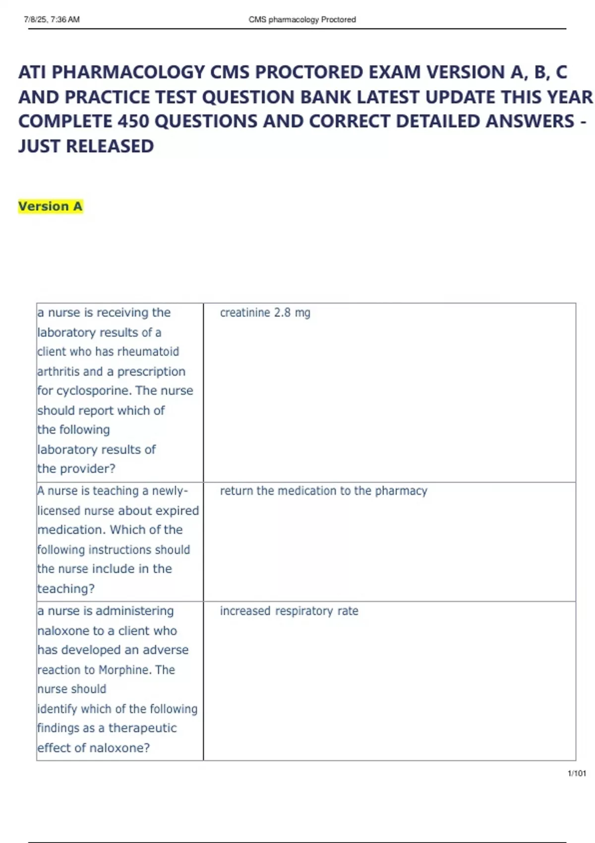 ATI PHARMACOLOGY CMS PROCTORED EXAM VERSION A, B, C
