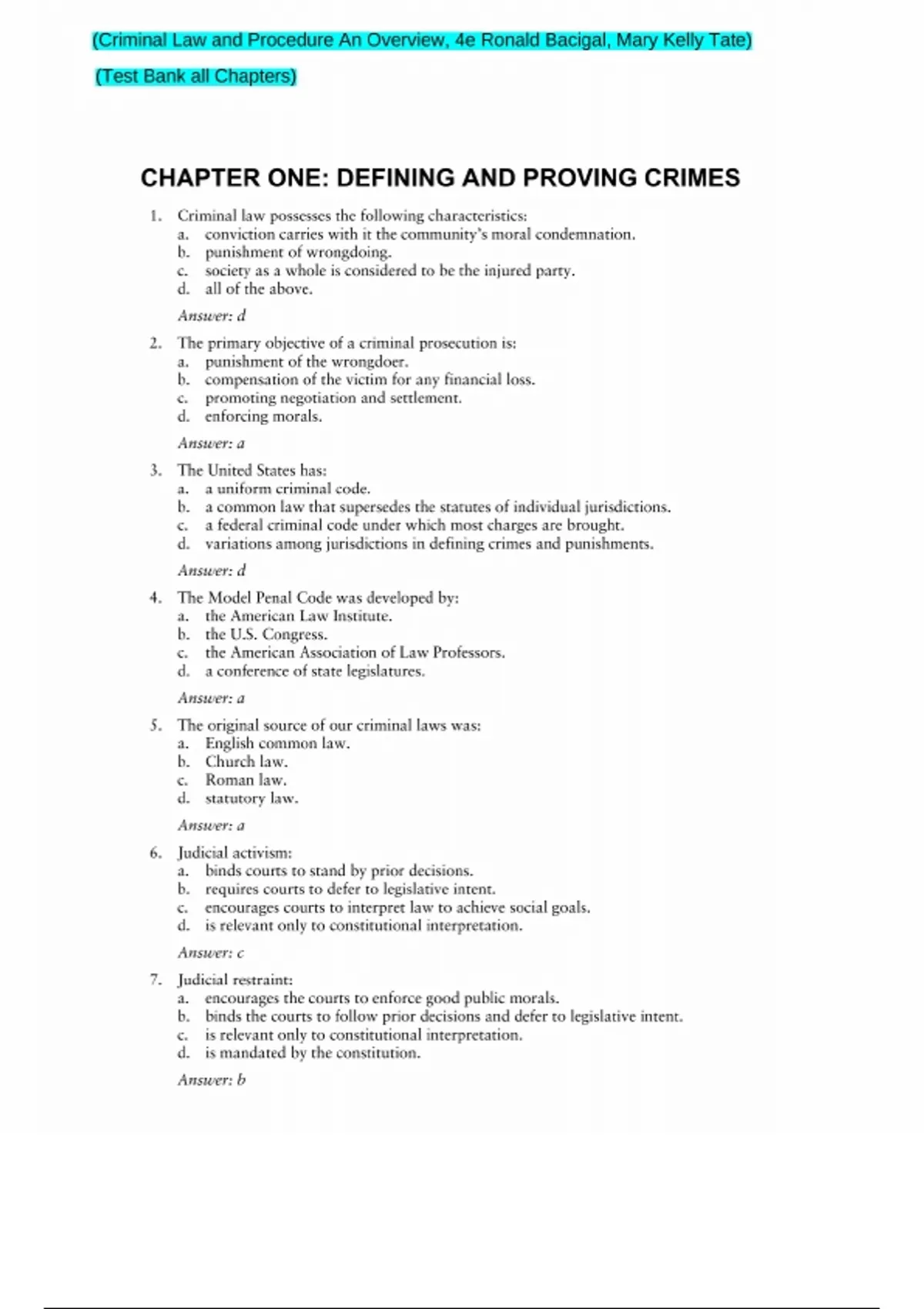 (Criminal Law and Procedure An Overview, 4e Ronald Bacigal, Mary Kelly Tate) (Test Bank all Chapters)