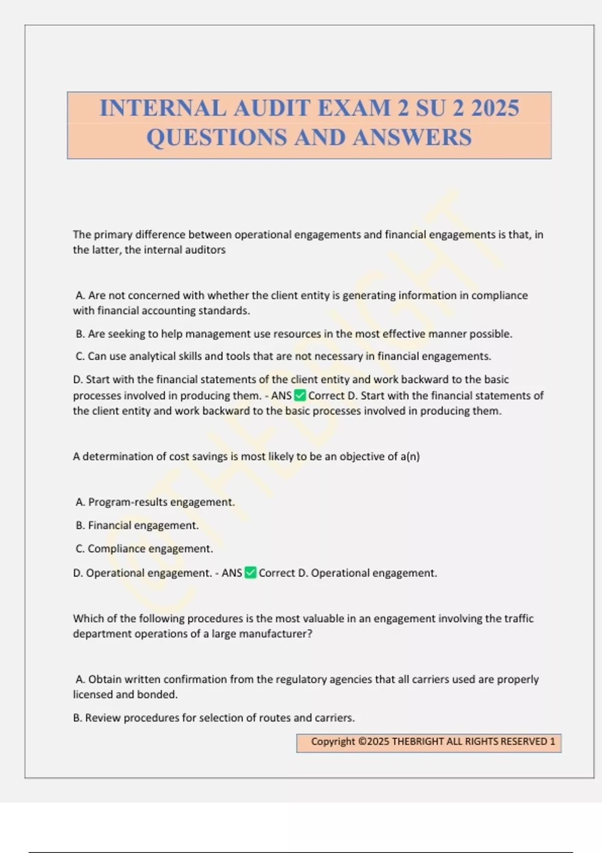 The primary difference between operational engagements and financial engagements is that, in the latter, the internal auditors A. Are not concerned with whether the client entity is generating information in compliance with financial accounting standards. B. Are seeking to help management use resources in the most effective manner possible. C. Can use analytical skills and tools that are not necessary in financial engagements. D. Start with the financial statements of the client entity and work backward to the basic processes involved in producing them. - ANS Correct D. Start with the financial statements of the client entity and work backward to the basic processes involved in producing them. A determination of cost savings is most likely to be an objective of a(n) A. Program-results engagement. B. Financial engagement. C. Compliance engagement. D. Operational engagement. - ANS Correct D. Operational engagement. Which of the following procedures is the most valuable in an engagement involving the traffic department operations of a large manufacturer? A. Obtain written confirmation from the regulatory agencies that all carriers used are properly licensed and bonded. B. Review procedures for selection of routes and carriers. INTERNAL AUDIT EXAM 2 SU 2 2025 QUESTIONS AND ANSWERS Copyright ©2025 THEBRIGHT ALL RIGHTS RESERVED 2 C. Trace selected items from the weekly demurrage (car detention charge) report to supporting documentation. D. Verify that all bills of lading are prenumbered. - ANS Correct B. Review procedures for selection of routes and carriers. Which of the following activities is outside the scope of internal auditing? A. Evaluating risk exposures regarding compliance with policies, procedures, and contracts. B. Safeguarding of assets. C. Evaluating risk exposures regarding compliance with laws and regulations. D. Ascertaining the extent to which management has established criteria to determine whether objectives have been accomplished. - ANS Correct B. Safeguarding of assets. Which of the following statements about control self-assessment (CSA) is false? A. CSA is usually an informal and undocumented process. B. In its purest form, CSA integrates business objectives and risks with control processes. C. CSA is also known as control/risk self-assessment. D. Most implemented CSA programs share some key features and goals. - ANS Correct A. CSA is usually an informal and undocumented process. Which type of facilitated approach format begins by listing all possible barriers, obstacles, threats, and exposures that might prevent achieving an objective? A. Objective-based format. B. Control-based format. C. Process-based format. D. Risk-based format. - ANS Correct D. Risk