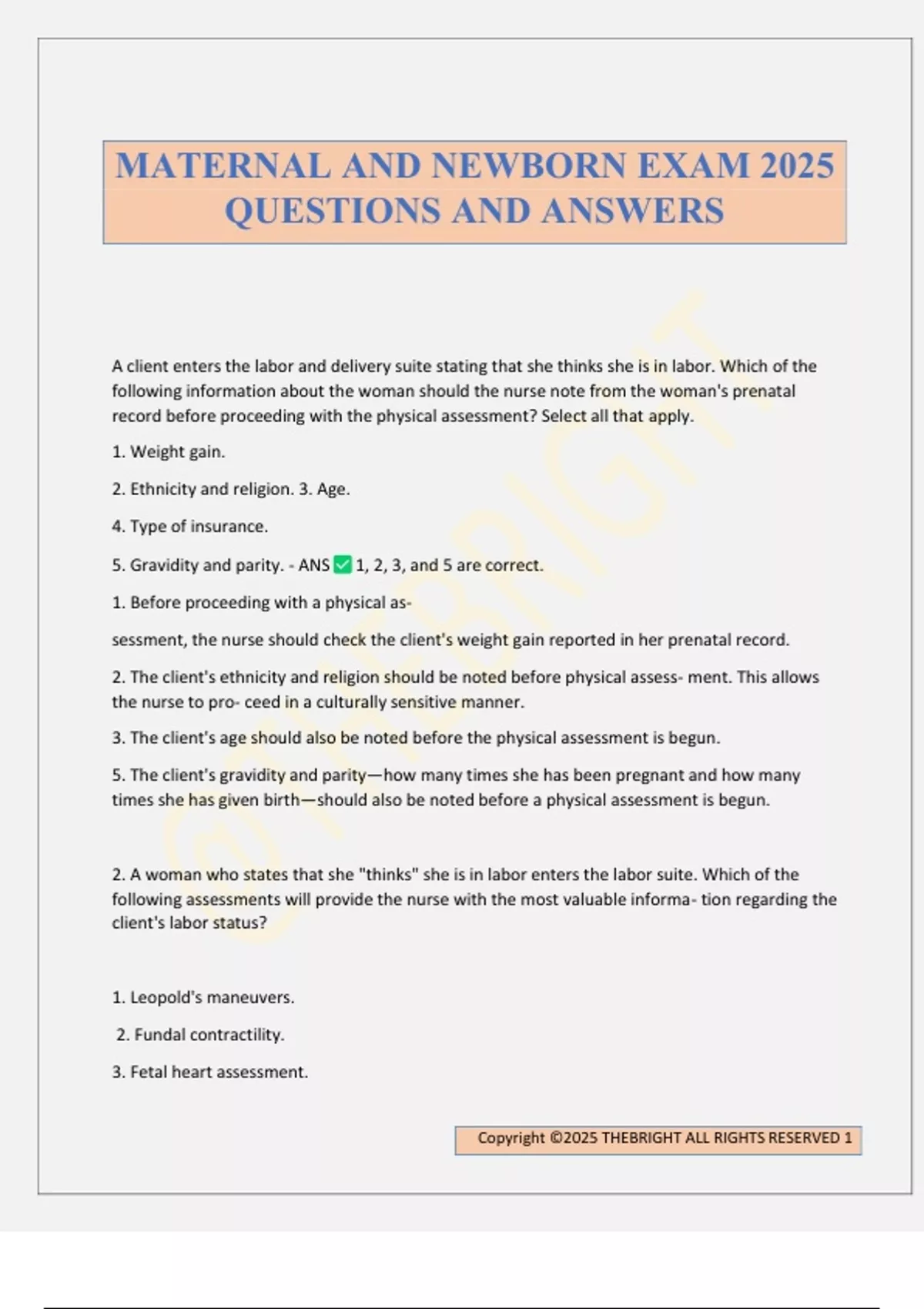 A client enters the labor and delivery suite stating that she thinks she is in labor. Which of the following information about the woman should the nurse note from the woman's prenatal record before proceeding with the physical assessment? Select all that apply. 1. Weight gain. 2. Ethnicity and religion. 3. Age. 4. Type of insurance. 5. Gravidity and parity. - ANS 1, 2, 3, and 5 are correct. 1. Before proceeding with a physical as- sessment, the nurse should check the client's weight gain reported in her prenatal record. 2. The client's ethnicity and religion should be noted before physical assess- ment. This allows the nurse to pro- ceed in a culturally sensitive manner. 3. The client's age should also be noted before the physical assessment is begun. 5. The client's gravidity and parity—how many times she has been pregnant and how many times she has given birth—should also be noted before a physical assessment is begun. 2. A woman who states that she "thinks" she is in labor enters the labor suite. Which of the following assessments will provide the nurse with the most valuable informa- tion regarding the client's labor status? 1. Leopold's maneuvers. 2. Fundal contractility. 3. Fetal heart assessment. MATERNAL AND NEWBORN EXAM 2025 QUESTIONS AND ANSWERS Copyright ©2025 THEBRIGHT ALL RIGHTS RESERVED 2 4. Vaginal examination. - ANS 4. Vaginal Examination - A vaginal examination will provide the nurse with the best information about the status of labor. A client in labor, G2 P1001, was admitted 1 hour ago at 2 cm dilated and 50% effaced. She was talkative and excited at that time. During the past 10 minutes she has become serious, closing her eyes and breathing rapidly with each contraction. Which of the following is an accurate nursing assessment of the situation? 1. The client had poor childbirth education prior to labor. 2. The client is exhibiting an expected behavior for labor. 3. The client is becoming hypoxic and hypercapnic. 4. The client needs her alpha-fetoprotein levels checked. - ANS 2. The client is exhibiting an expected behavior for labor. - The woman is showing expected signs of the active phase of labor. A woman has just arrived at the labor and delivery suite. In order to report the client's status to her primary health care practitioner, which of the following assess- ments should the nurse perform? Select all that apply. 1. Fetal heart rate. 2. Contraction pattern. 3. Contraction stress test. 4. Vital signs. 5. Biophysical profile. - ANS 1, 2, and 4 are correct. 1. The nurse should assess the fetal heart before reporting the client's status to the health care provider. 2. The nurse should assess the contrac- tion pattern before reporting the client's status. Copyright ©2025 THEBRIGHT ALL RIGHTS RESERVED 3 3. A contraction stress test is only performed if ordered by a health care practitioner. 4. The nurse should assess the woman's vital signs before reporting her status. 5. A biophysical profile is only performed if ordered by a health care practitioner. While performing Leopold's maneuvers on a woman in labor, the nurse palpates a hard round mass in the fundal area, a flat surface on the left side, small objects on the right side, and a soft round mass just above the symphysis. Which of the fol- lowing is a reasonable conclusion by the nurse? 1. The fetal position is transverse. 2. The fetal presentation is vertex. 3. The fetal lie is vertical. 4. The fetal attitude is flexed. - ANS 3. With the findings of a hard round mass in the fundal area and soft round mass above the symphysis, the nurse can conclude that the fetal lie is vertical. When during the latent phase of labor should the nurse assess the fetal heart pattern of a low- risk woman, G1 P0000? Select all that apply. 1. After vaginal exams. 2. Before administration of analgesics. 3. Periodically at the end of a contraction. 4. Every ten minutes. 5. Before ambulating. - ANS 1, 2, 3, and 5 are correct. 1. The nurse should assess the fetal heart after all vaginal exams. 2. The nurse should assess the fetal Copyright ©2025 THEBRIGHT ALL RIGHTS RESERVED 4 heart before giving the mother any analgesics. 3. The fetal heart should be assessed pe- riodically at the end of a contraction. 4. The fetal heart pattern should be as- sessed every 1 hour during the latent phase of a low- risk labor. It is not stan- dard protocol to assess every 10 minutes. 5. The nurse should assess the fetal heart before the woman ambulates. The nurse is assessing the fetal station during a vaginal examination. Which of the following structures should the nurse palpate? 1. Sacral promontory. 2. Ischial spines. 3. Cervix. 4. Symphysis pubis. - ANS 2. Station is assessed by palpating the ischial spines. The labor and delivery nurse performs Leopold's maneuvers. A soft round mass is felt in the fundal region. A flat object is noted on the left and small objects are noted on the right of the uterus. A hard round mass is noted above the symphysis. Which of the following positions is consistent with these findings? 1. Left occipital anterior (LOA) 2. Left sacral posterior (LSP) 3. Right mentum anterior (RMA) 4. Right sacral posterior (RSP) - ANS 1. The nurse's findings upon performing Leopold's maneuvers indicate that the fetus is in the left occiput anterior po- sition (LOA)—that is, the fetal back is felt on the mother's left side, the small parts are felt on her right side, the buttocks are felt in the fundal re- gion, and the head is felt above her symphysis. A nurse is caring for a laboring woman who is in transition. Which of the following signs/symptoms would indicate that the woman is progressing into the second stage of labor? Select all that apply. 1. Bulging perineum. 2. Increased bloody show. 3. Spontaneous rup