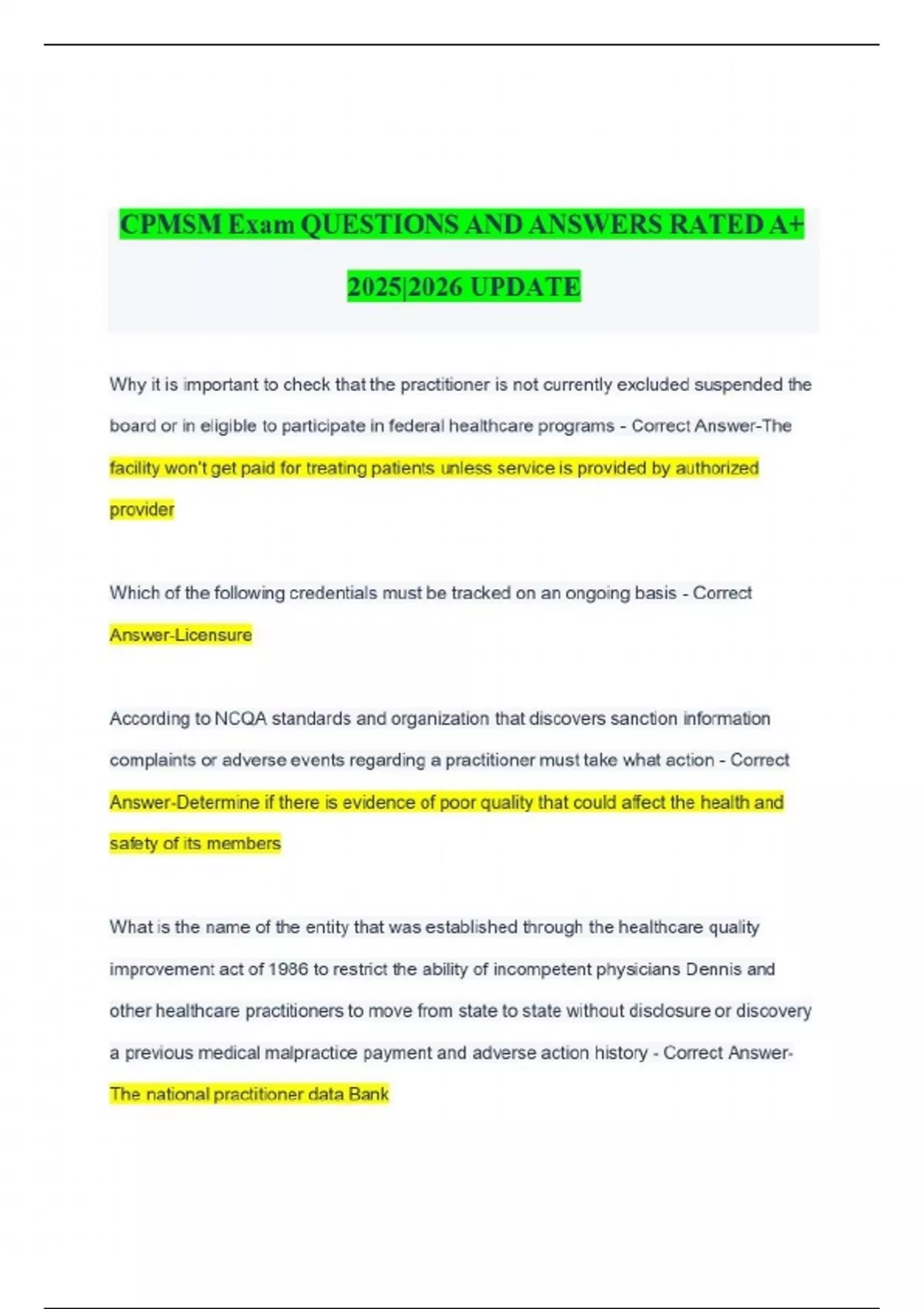 CPMSM Exam QUESTIONS AND ANSWERS RATED A+ 2025|2026 UPDATE Why it is important to check that the practitioner is not currently excluded suspended the board or in eligible to participate in federal healthcare programs - Correct Answer-The facility won't get paid for treating patients unless service is provided by authorized provider Which of the following credentials must be tracked on an ongoing basis - Correct Answer-Licensure According to NCQA standards and organization that discovers sanction information complaints or adverse events regarding a practitioner must take what action - Correct Answer-Determine if there is evidence of poor quality that could affect the health and safety of its members