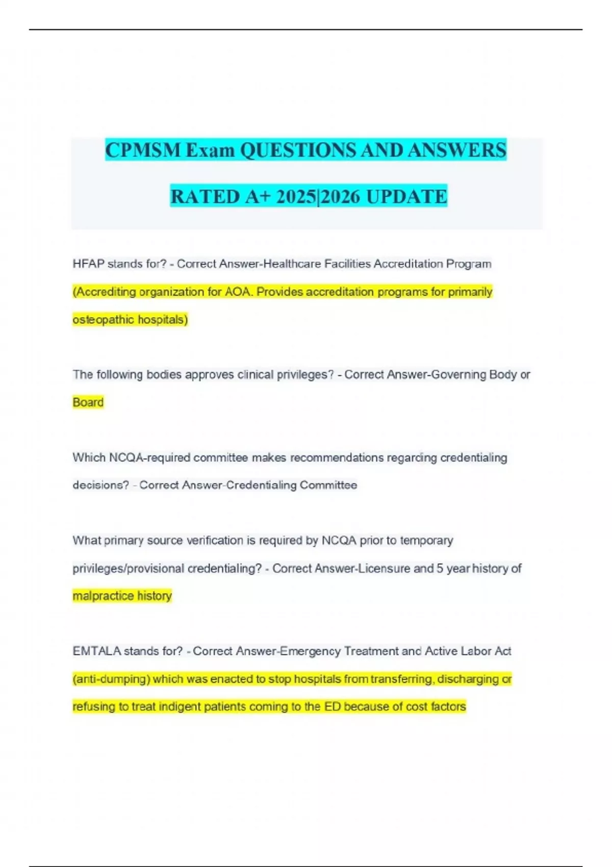 CPMSM Exam QUESTIONS AND ANSWERS RATED A+ 2025|2026 UPDATE HFAP stands for? - Correct Answer-Healthcare Facilities Accreditation Program (Accrediting organization for AOA. Provides accreditation programs for primarily osteopathic hospitals) The following bodies approves clinical privileges? - Correct Answer-Governing Body or Board Which NCQA-required committee makes recommendations regarding credentialing decisions? - Correct Answer-Credentialing Committee What primary source verification is required by NCQA prior to temporary privileges/provisional credentialing? - Correct Answer-Licensure and 5 year history of malpractice history EMTALA stands for? - Correct Answer-Emergency Treatment and Active Labor Act (anti-dumping) which was enacted to stop hospitals from transferring, discharging or refusing to treat indigent patients coming to the ED because of cost factors