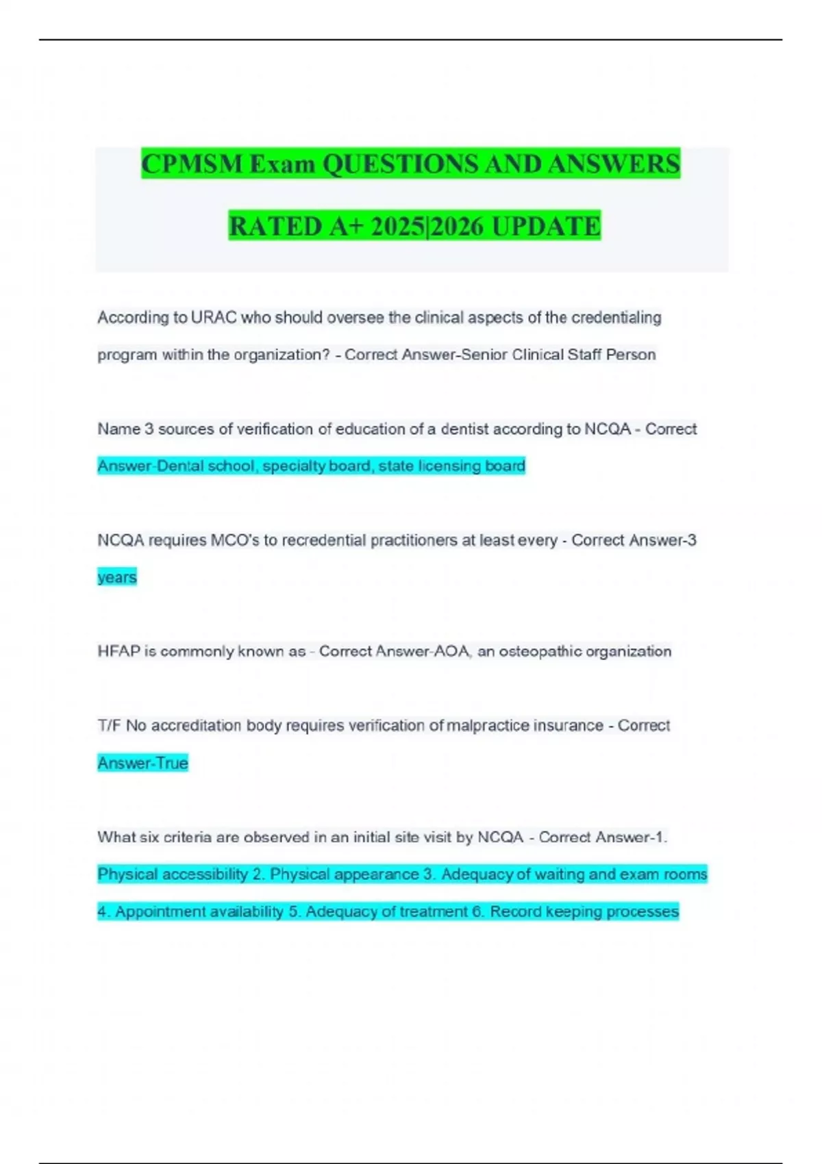 CPMSM Exam QUESTIONS AND ANSWERS RATED A+ 2025|2026 UPDATE According to URAC who should oversee the clinical aspects of the credentialing program within the organization? - Correct Answer-Senior Clinical Staff Person Name 3 sources of verification of education of a dentist according to NCQA - Correct Answer-Dental school, specialty board, state licensing board NCQA requires MCO's to recredential practitioners at least every - Correct Answer-3 years HFAP is commonly known as - Correct Answer-AOA, an osteopathic organization T/F No accreditation body requires verification of malpractice insurance - Correct Answer-True What six criteria are observed in an initial site visit by NCQA - Correct Answer-1. Physical accessibility 2. Physical appearance 3. Adequacy of waiting and exam rooms 4. Appointment availability 5. Adequacy of treatment 6. Record keeping processes