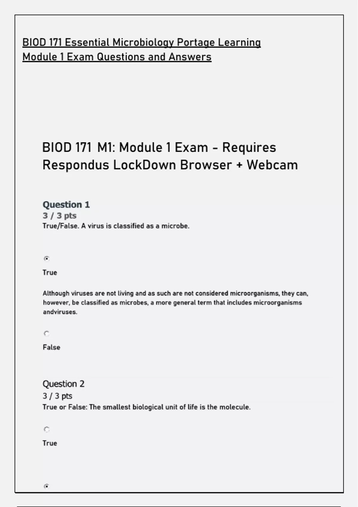 BIOD 171 Essential Microbiology Portage Learning Module 1 Exam Questions and Answers BIOD 171 M1: Module 1 Exam - Requires Respondus LockDown Browser + Webcam