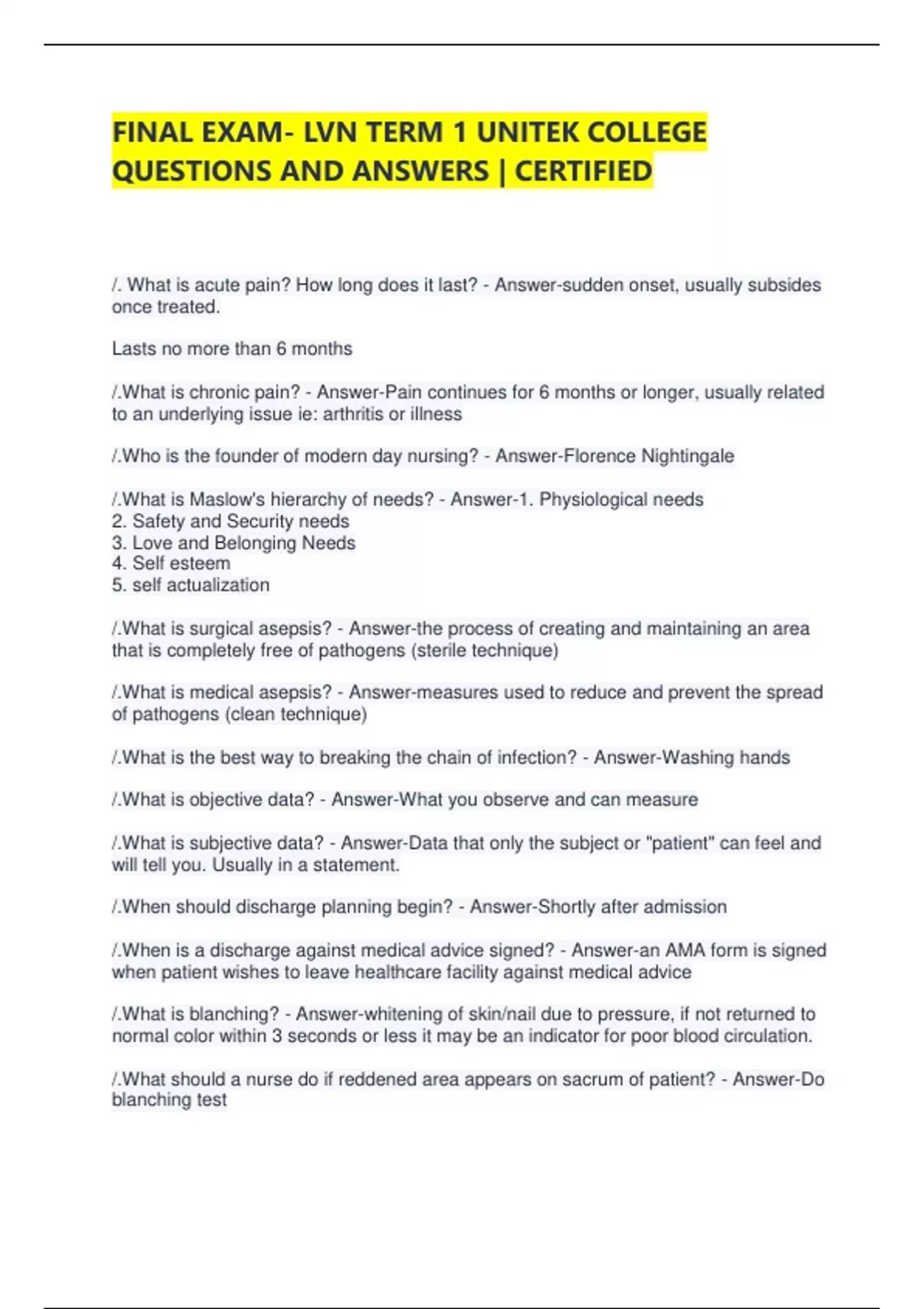 FINAL EXAM- LVN TERM 1 UNITEK COLLEGE QUESTIONS AND ANSWERS | CERTIFIED /. What is acute pain? How long does it last? - Answer-sudden onset, usually subsides once treated. Lasts no more than 6 months /.What is chronic pain? - Answer-Pain continues for 6 months or longer, usually related to an underlying issue ie: arthritis or illness /.Who is the founder of modern day nursing? - Answer-Florence Nightingale /.What is Maslow's hierarchy of needs? - Answer-1. Physiological needs 2. Safety and Security needs 3. Love and Belonging Needs 4. Self esteem 5. self actualization /.What is surgical asepsis? - Answer-the process of creating and maintaining an area that is completely free of pathogens (sterile technique) /.What is medical asepsis? - Answer-measures used to reduce and prevent the spread of pathogens (clean technique) /.What is the best way to breaking the chain of infection? - Answer-Washing hands /.What is objective data? - Answer-What you observe and can measure /.What is subjective data? - Answer-Data that only the subject or "patient" can feel and will tell you. Usually in a statement. /.When should discharge planning begin? - Answer-Shortly after admission /.When is a discharge against medical advice signed? - Answer-an AMA form is signed when patient wishes to leave healthcare facility against medical advice /.What is blanching? - Answer-whitening of skin/nail due to pressure, if not returned to normal color within 3 seconds or less it may be an indicator for poor blood circulation. /.What should a nurse do if reddened area appears on sacrum of patient? - Answer-Do blanching test apply barrier cream make sure pt is being repositioned every 2 hrs /.What is informed consent? - Answer-permission granted in the knowledge of the possible consequences, typically that which is given by a patient to a doctor for treatment with full knowledge of the possible risks and benefits. /.What is a DNR order? - Answer-Do Not Resuscitate- do NOT perform CPR /.What are nursing intervention to aid a patient to liquify bronchial secretions? - Answer-Humidifier hydration through fluid intake percussion on back administer mucolytic /.What is culture competence? - Answer-Awareness by the nurse of his/hers own cultural belief practices and an understanding of the limitations that these beliefs put on the nurse when dealing with those of other cultures. Should allow nurse to react to other cultures with openness and acceptance of cultural differences between them /.What is HIPAA? - Answer-Health Insurance Portability and Accountability Act To protect pt information from being disclosed without consent or knowledge /.What is a vegan diet? What are the vitamin deficiency? - Answer-one that excludes all animal products vitamin B12 /.what are signs of neglect ? - Answer-Malnutrition (losing weight) poor hygiene unexplained bruises and welts pressure injuries /.Why should nurses be direct/honest when communicating with client that has suffered physical abuse ? - Answer-To gain pt trust /.What is genetic theory of aging? - Answer-Proposes that the organism is genetically programmed for a predetermined number of cell divisions, after which cells/organisms die /.What is palliative care? - Answer-manages symptoms, provide psychosial support, coordinate care to relieve suffering and improve quality of life for cts with serious illnesses