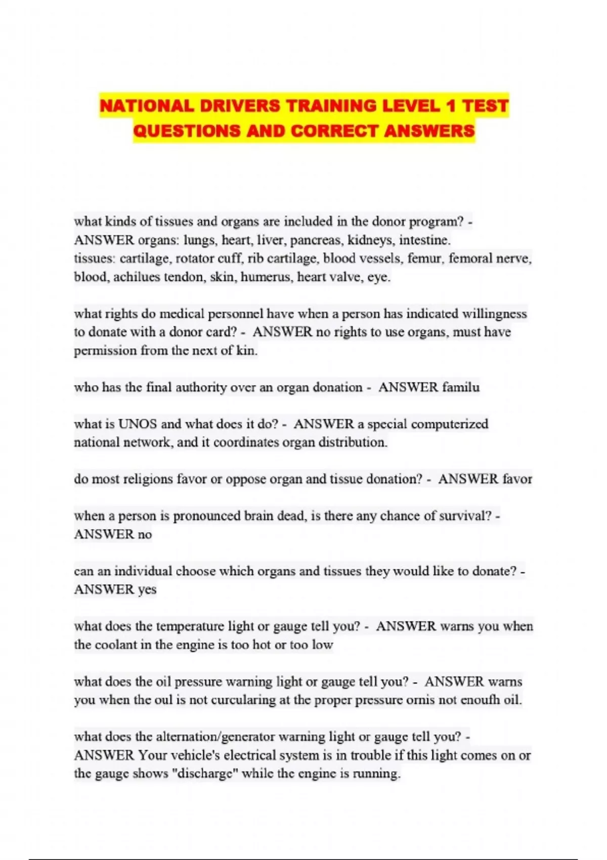 NATIONAL DRIVERS TRAINING LEVEL 1 TEST QUESTIONS AND CORRECT ANSWERS....