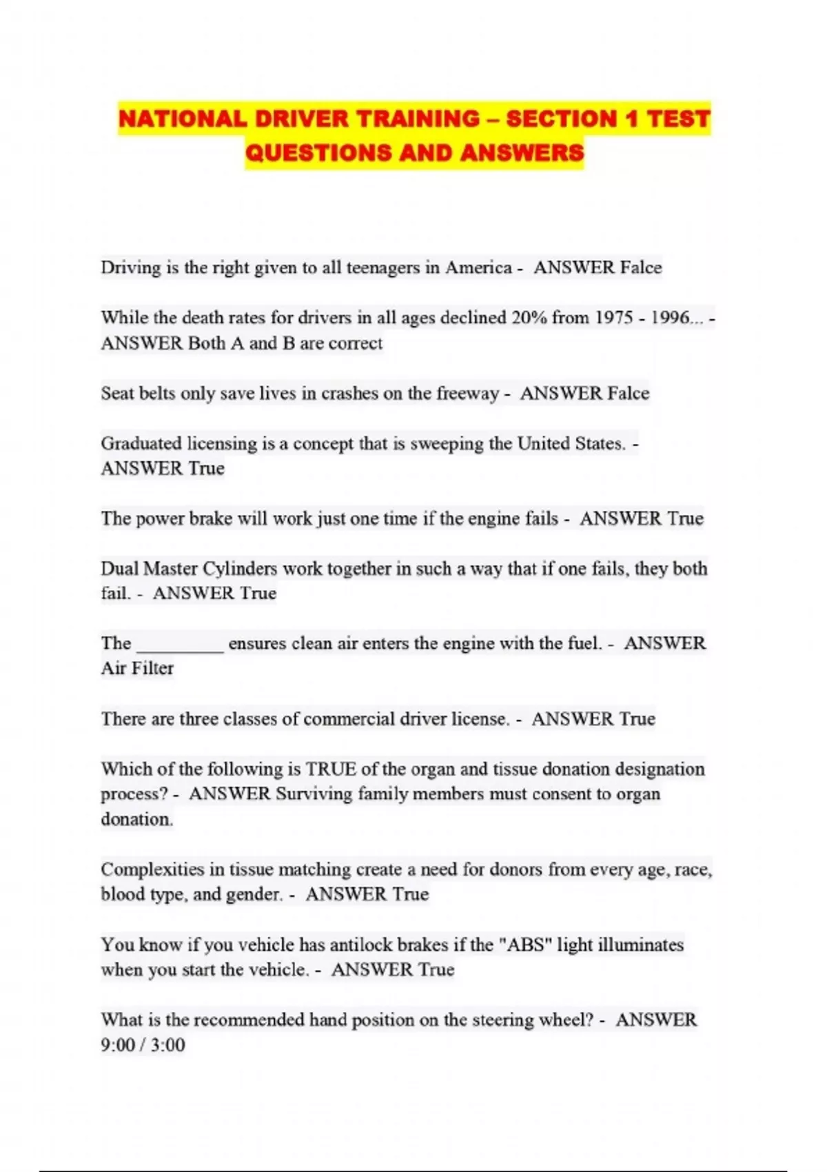 NATIONAL DRIVER TRAINING – SECTION 1 TEST QUESTIONS AND ANSWERS...