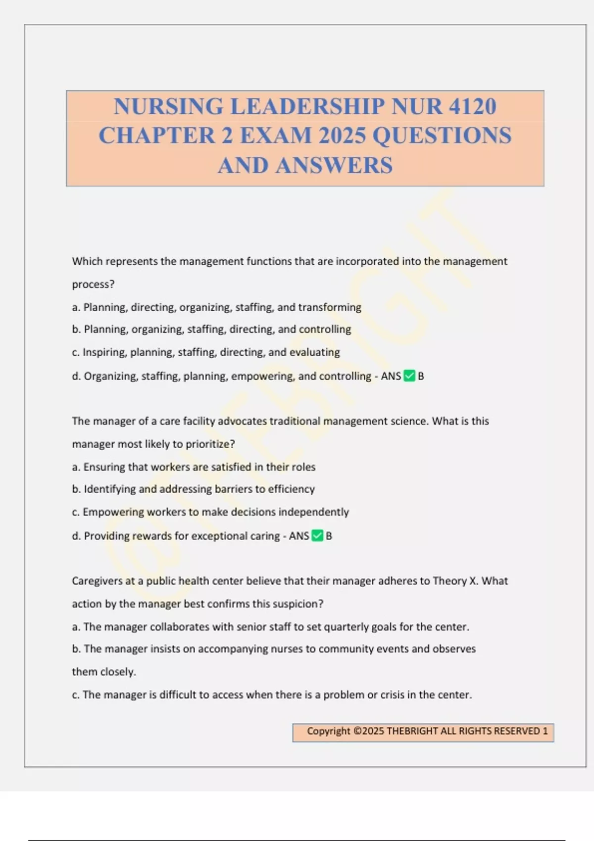 Which represents the management functions that are incorporated into the management process? a. Planning, directing, organizing, staffing, and transforming b. Planning, organizing, staffing, directing, and controlling c. Inspiring, planning, staffing, directing, and evaluating d. Organizing, staffing, planning, empowering, and controlling - ANS B The manager of a care facility advocates traditional management science. What is this manager most likely to prioritize? a. Ensuring that workers are satisfied in their roles b. Identifying and addressing barriers to efficiency c. Empowering workers to make decisions independently d. Providing rewards for exceptional caring - ANS B Caregivers at a public health center believe that their manager adheres to Theory X. What action by the manager best confirms this suspicion? a. The manager collaborates with senior staff to set quarterly goals for the center. b. The manager insists on accompanying nurses to community events and observes them closely. c. The manager is difficult to access when there is a problem or crisis in the center. NURSING LEADERSHIP NUR 4120 CHAPTER 2 EXAM 2025 QUESTIONS AND ANSWERS Copyright ©2025 THEBRIGHT ALL RIGHTS RESERVED 2 d. The manager allocates rewards based on the outcomes of nurses' work. - ANS B Accreditors are scheduled to visit a hospital site, and staff members have been made aware of what they will be assessing. What staff behavior would most clearly suggest the presence of the Hawthorne effect? a. The nurses consciously improve their performance because they know it is being scrutinized. b. The nurses avoid contact with the accreditors because they fear criticism. c. The manager blames individual nurses for deficits identified in the accreditation report. d. The manager temporarily adopts a leadership role. - ANS A The manager at a long-term care facility has intervened in a conflict between two staff members about the timing and length of lunch and coffee breaks. What management function is this manager demonstrating? a. Planning b. Organizing c. Directing d. Evaluating - ANS C A manager demonstrates one of the four principles of scientific management when he or she: a. shows an interest in employees' personal lives and emotional health. b. engages in lifelong learning and expects employees to do the same. c. allows employees to do their jobs independently, with minimal oversight. d. hires and promotes employees on the basis of their competence and skills. - ANS D What aspect of th