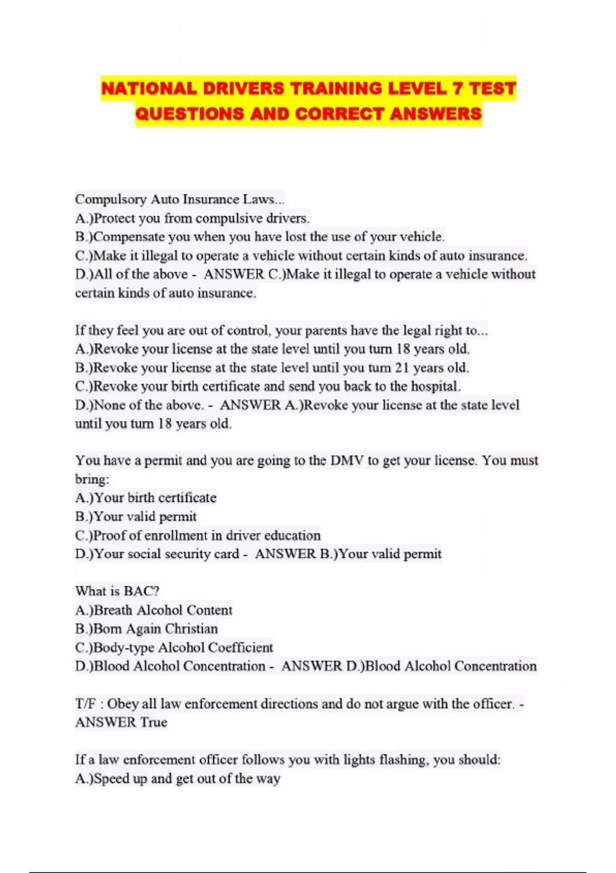 NATIONAL DRIVERS TRAINING LEVEL 7 TEST QUESTIONS AND CORRECT ANSWERS....
