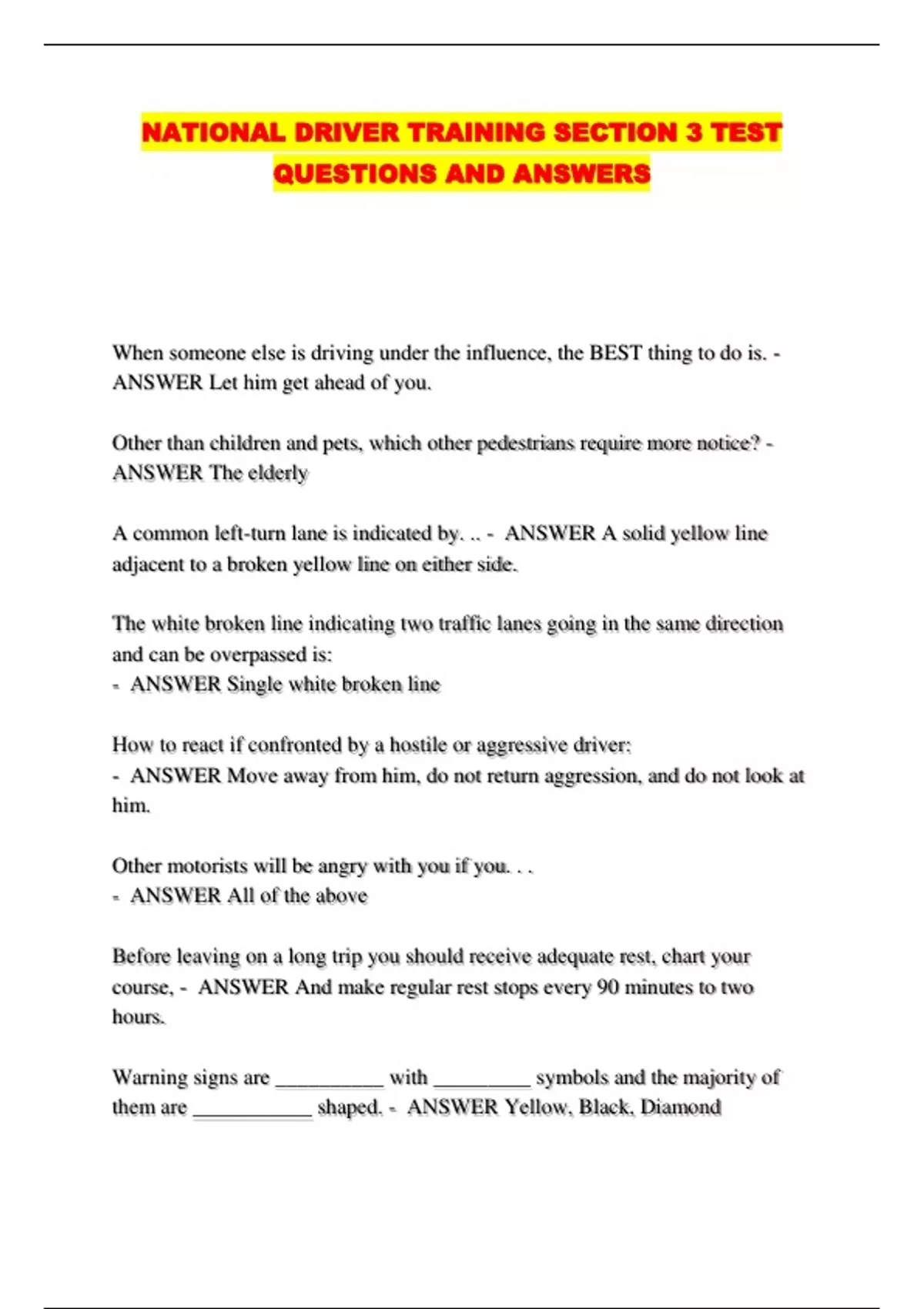 NATIONAL DRIVER TRAINING SECTION 3 TEST QUESTIONS AND ANSWERS...
